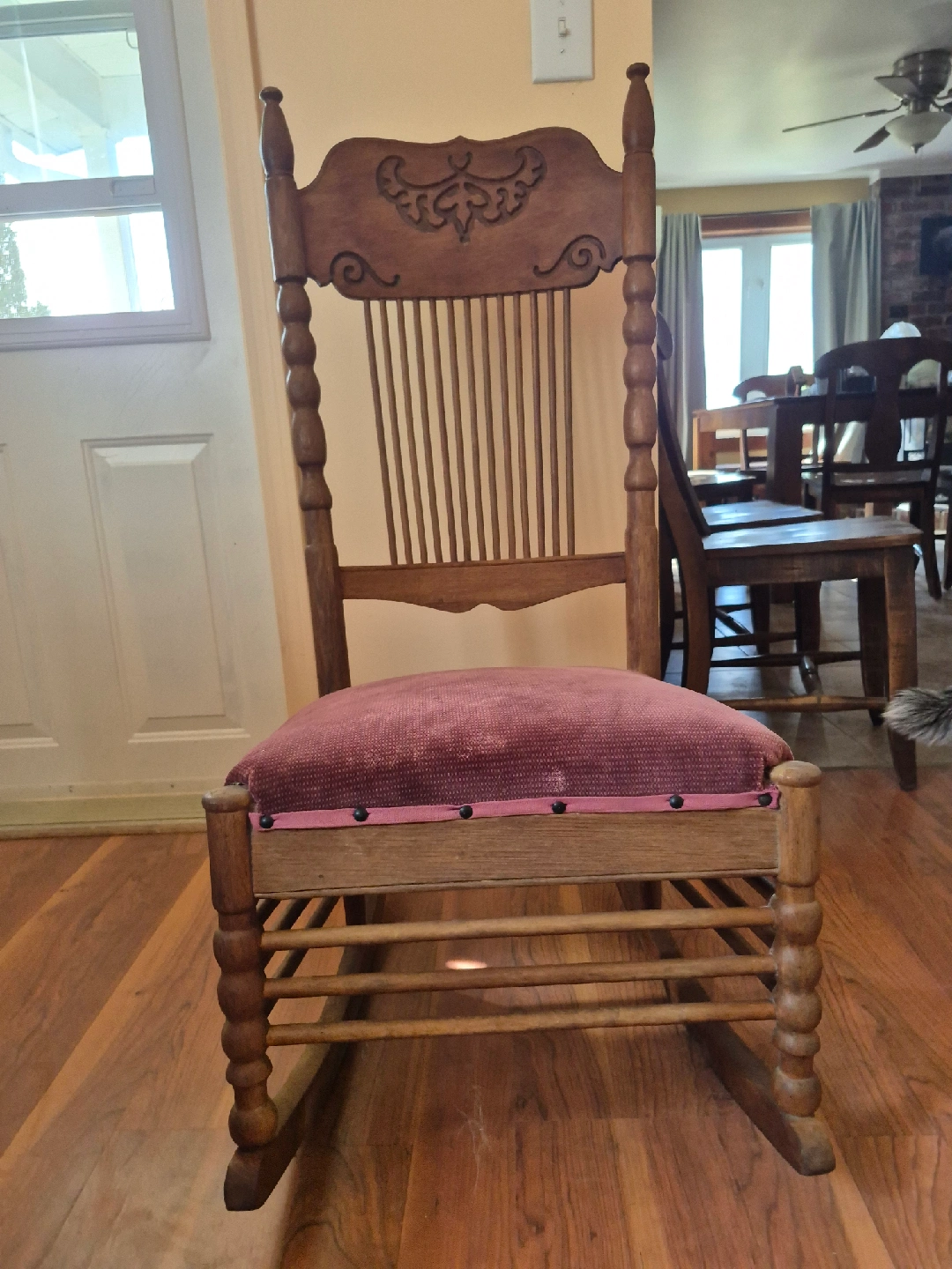 Selling a charming antique wooden rocking chair. It features a cushioned seat, perfect for relaxing. The chair has a lovely, classic design that would add character to any room