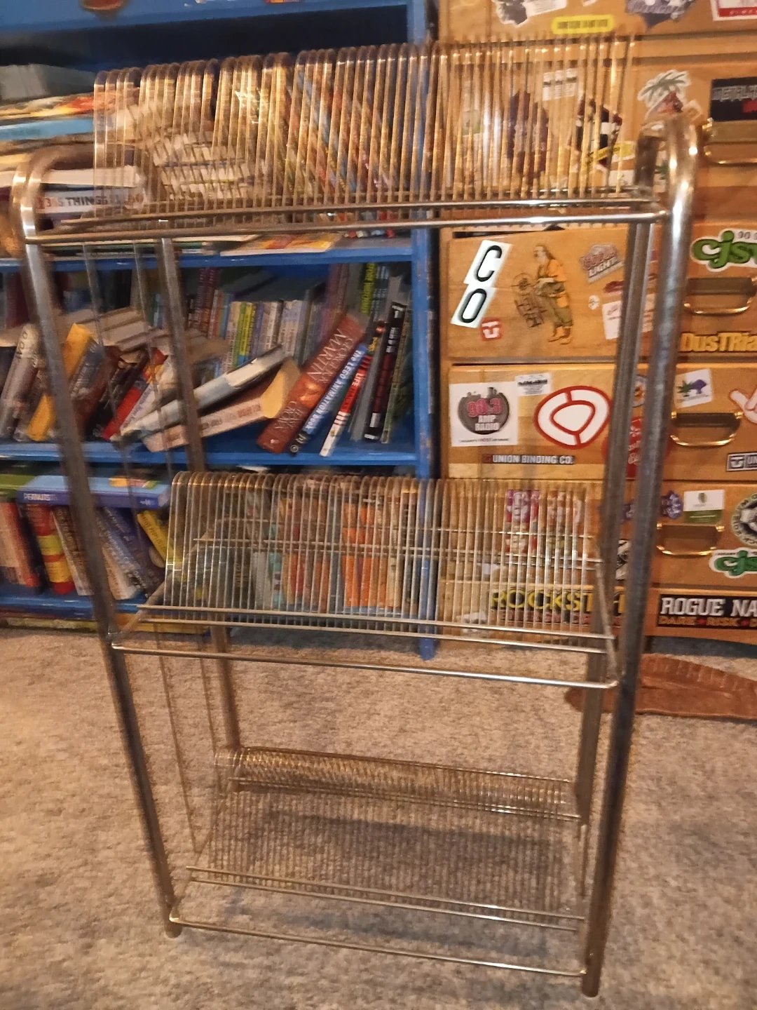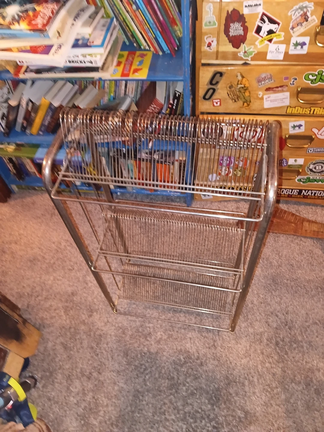 This vintage metal rack is great for storing vinyl records or magazines. It has three tiers with ample space for your collection. Its durable metal construction ensures it'll last for years!