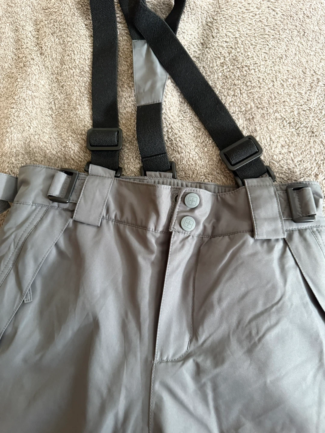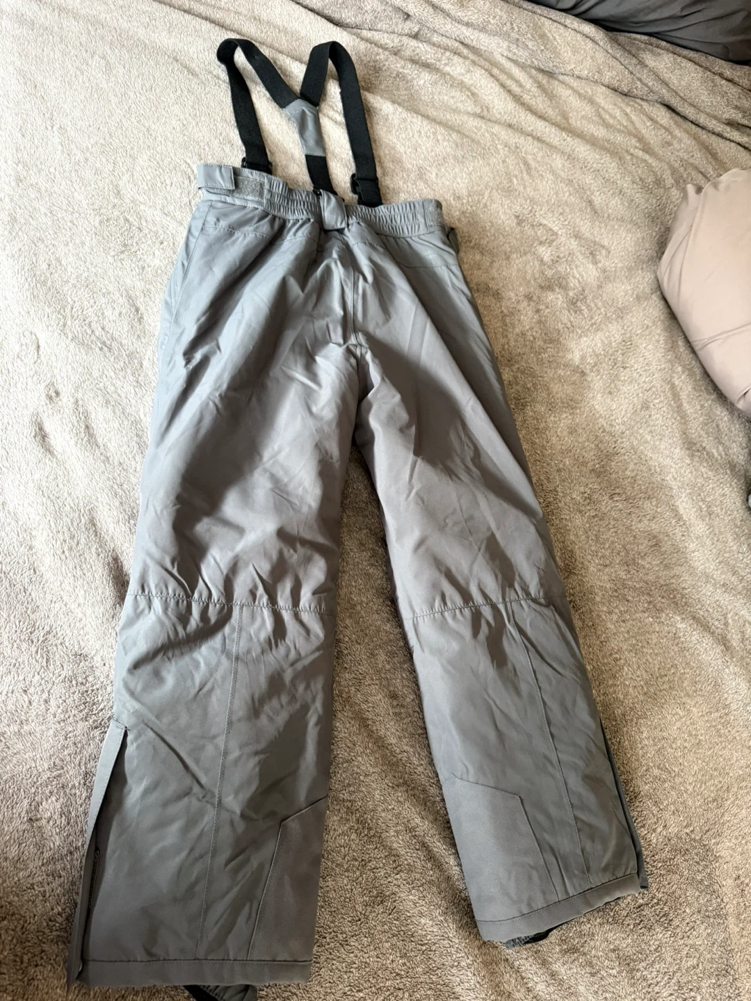 These grey snow bib pants are from Mountain Warehouse and are waterproof with taped seams. They're sized for 9-10 years. They feature adjustable straps for a comfortable fit. Great for keeping warm and dry during winter activities! My son wore it once.