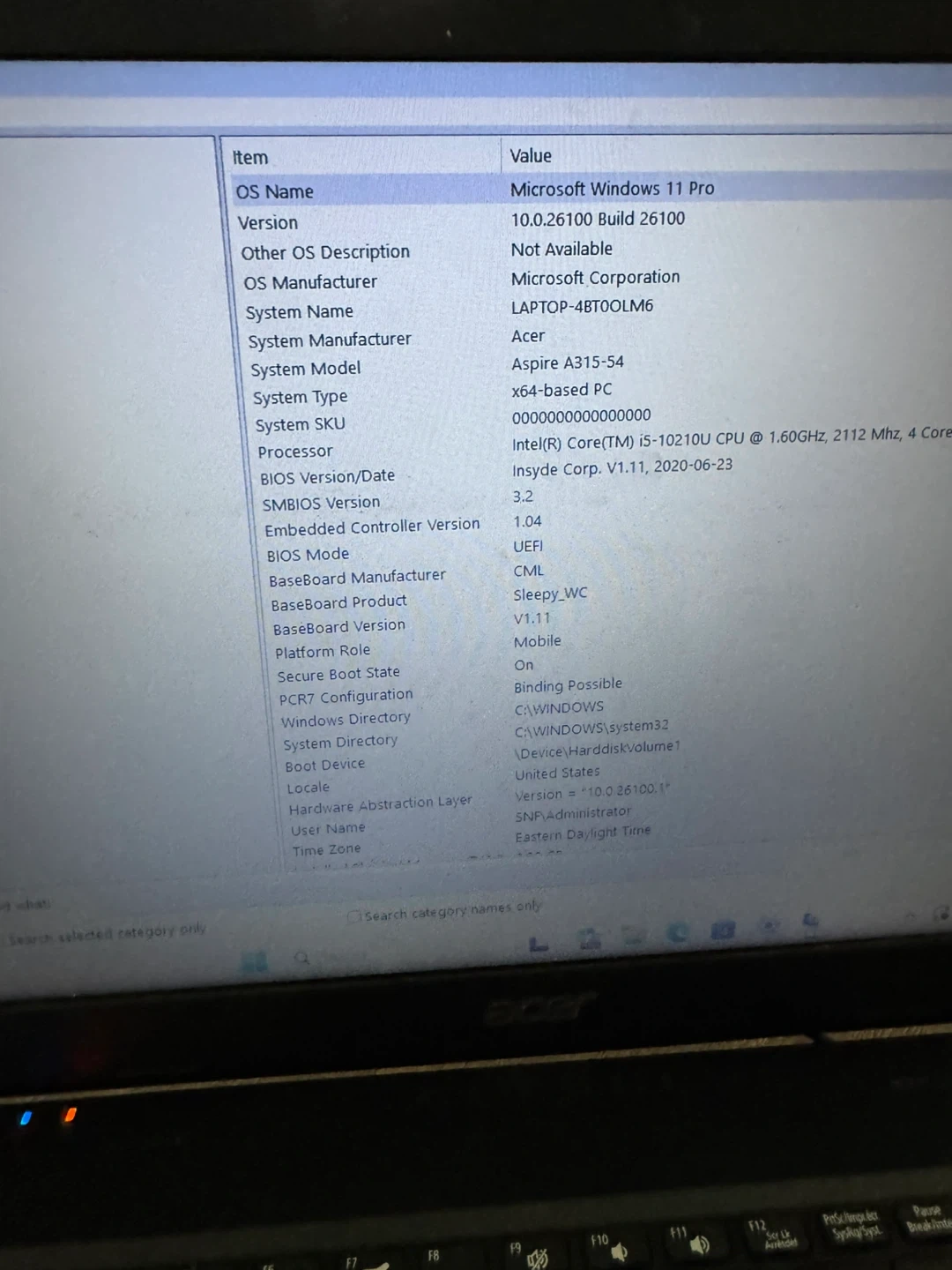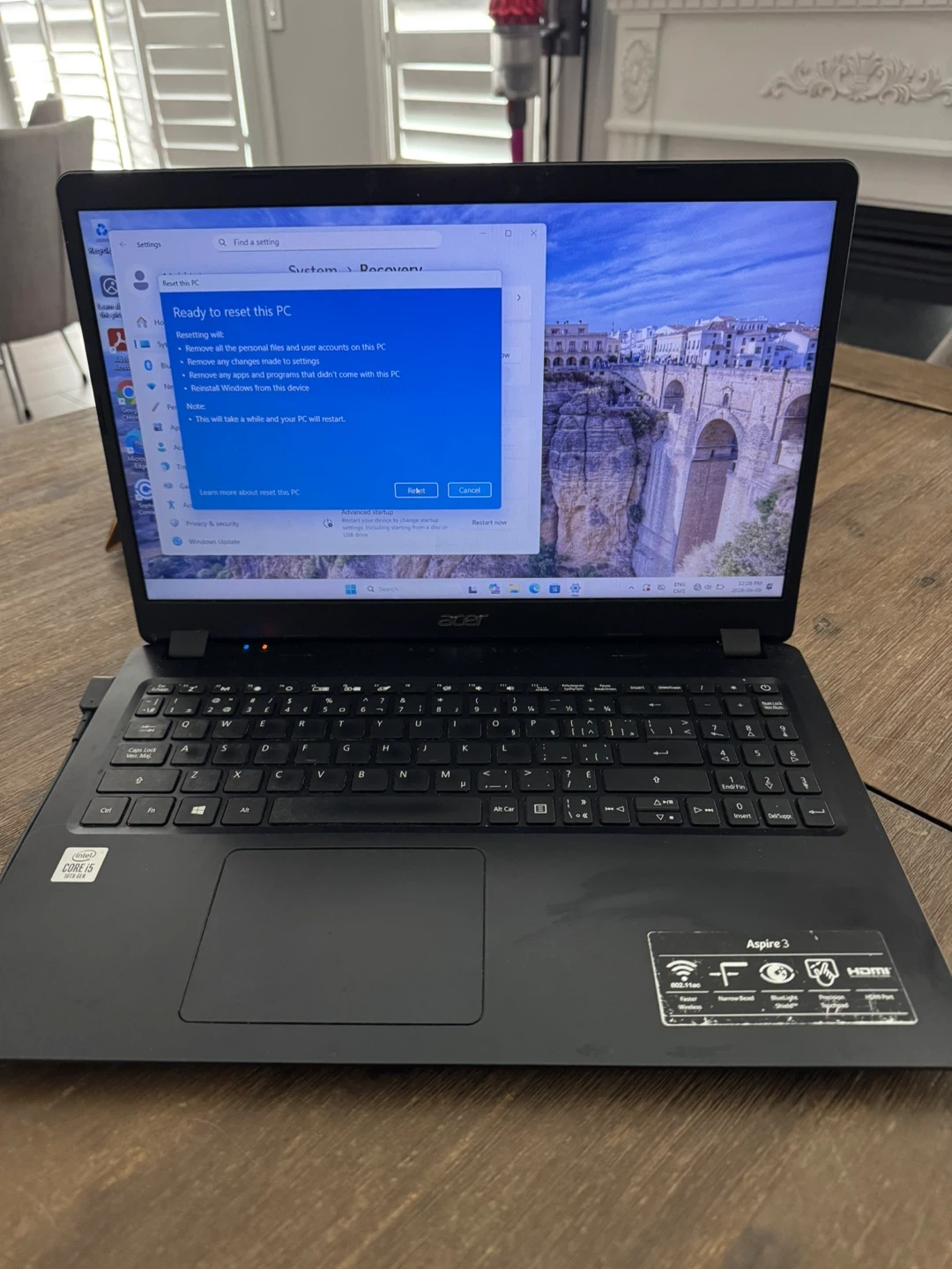 Acer Aspire 3 laptop with an Intel Core i5 processor. It runs Windows 11 Pro and has 237 GB of storage, with 8GB of Ram. This is a great laptop for everyday tasks! The headphone jack on side has a crack and doesn’t affect anything.