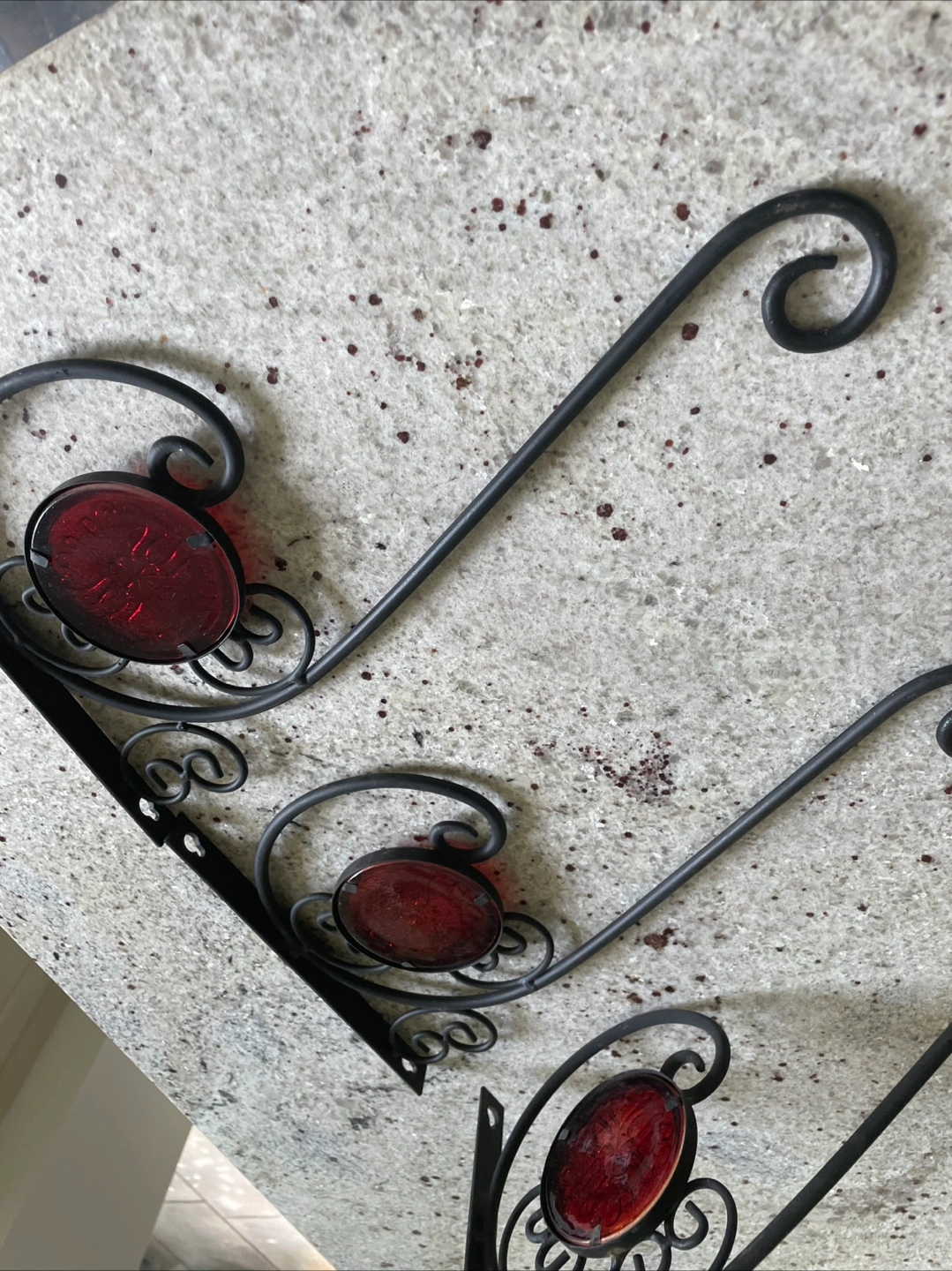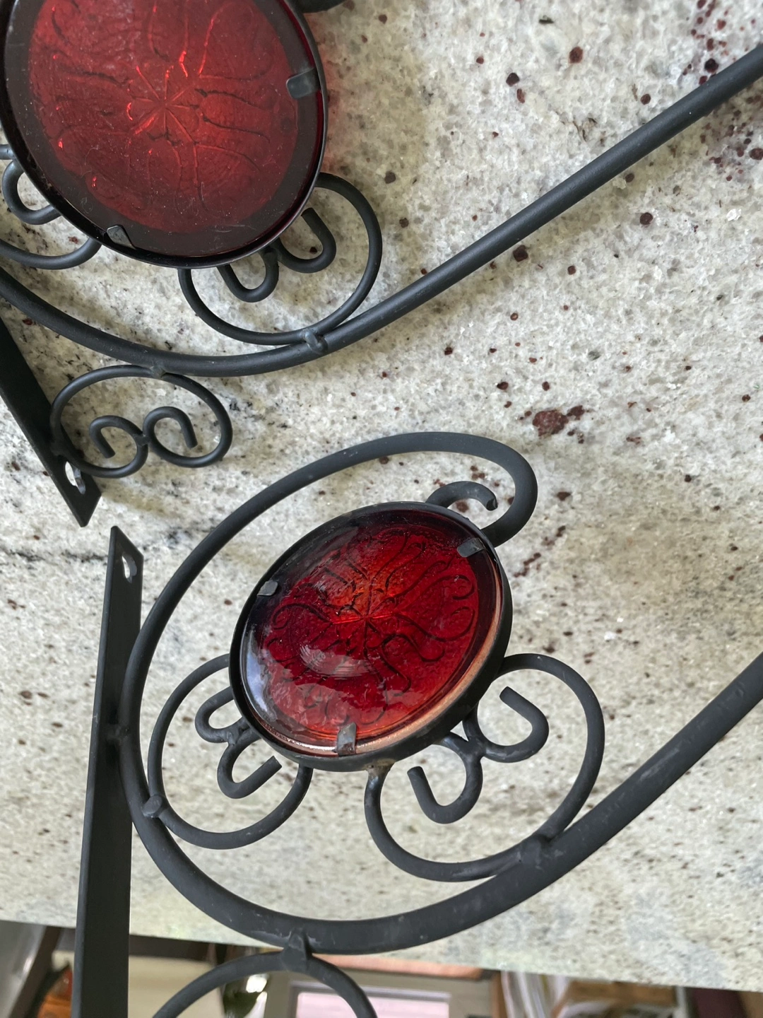 3 Ornate Red Glass & Black wrought iron brackets