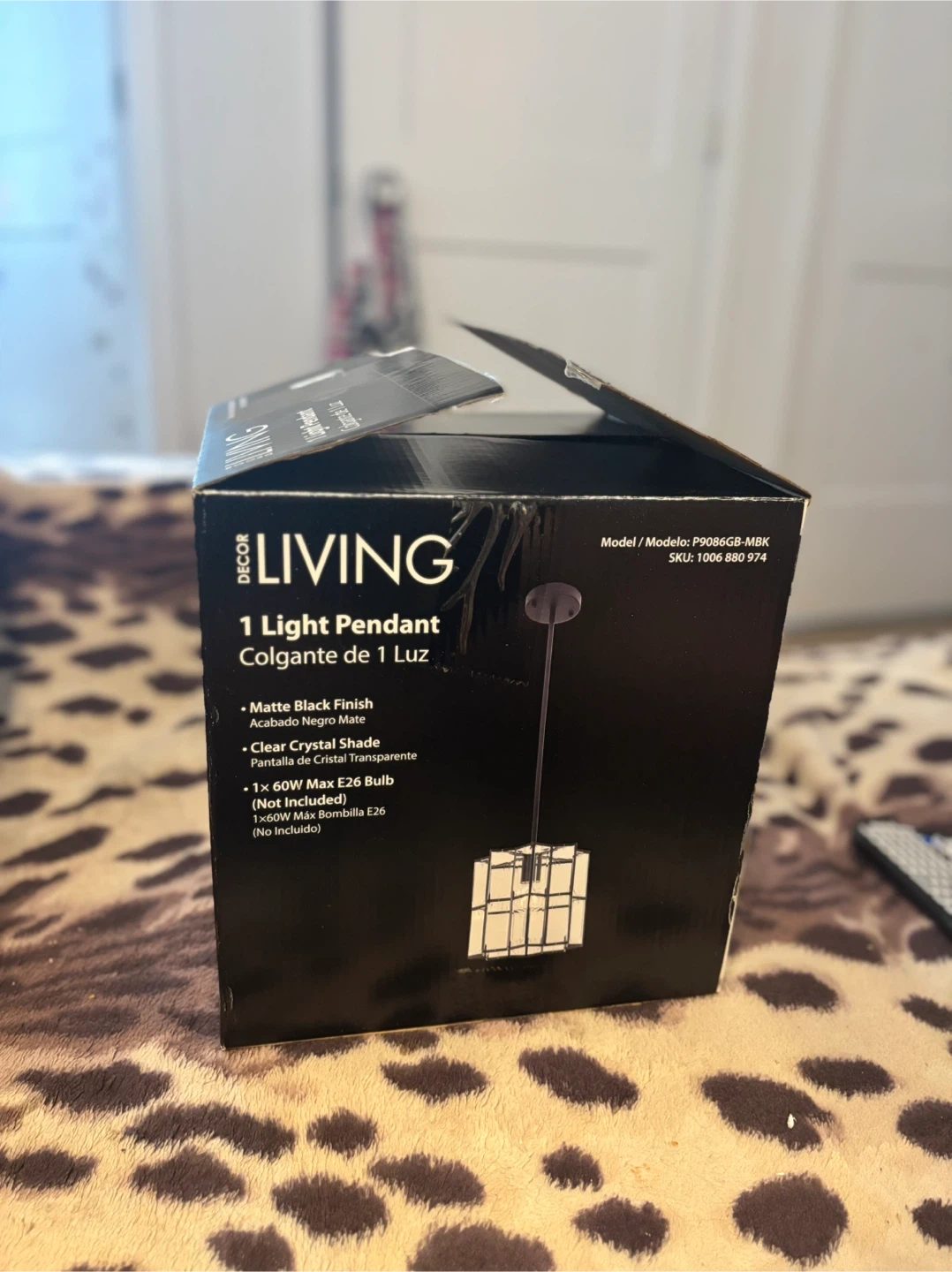 Selling a brand new Decor Living 1 Light Pendant! It features a matte black finish and a clear crystal shade. The box includes the pendant and instructions.