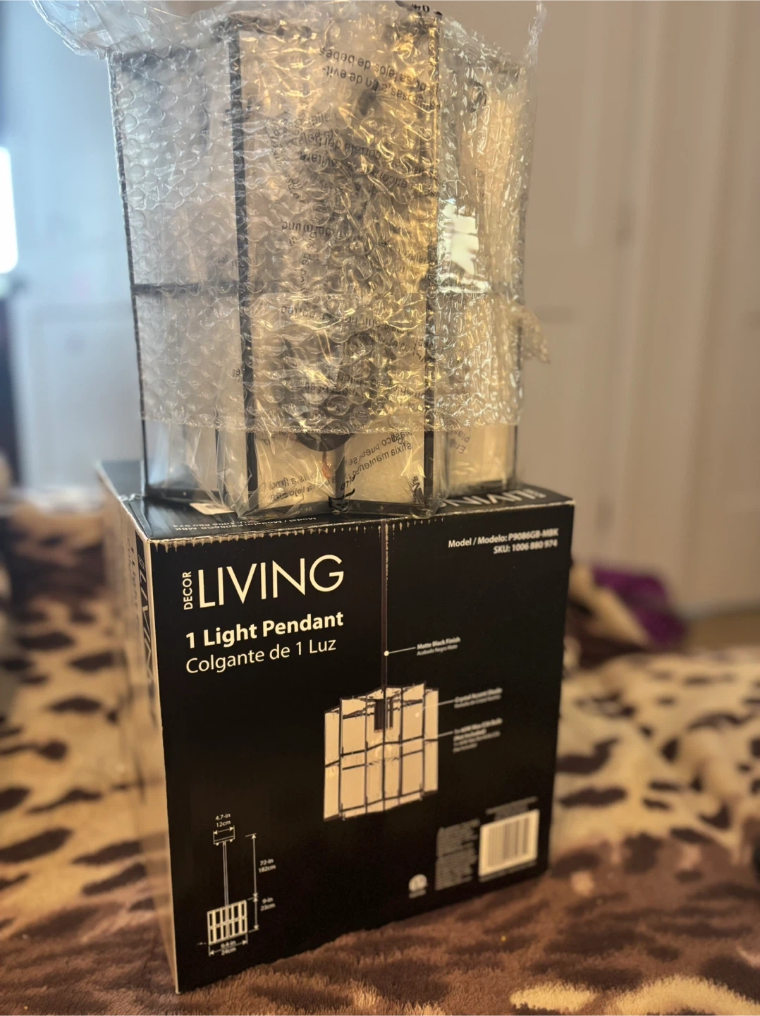 Selling a brand new Decor Living 1 Light Pendant! It features a matte black finish and a clear crystal shade. The box includes the pendant and instructions.