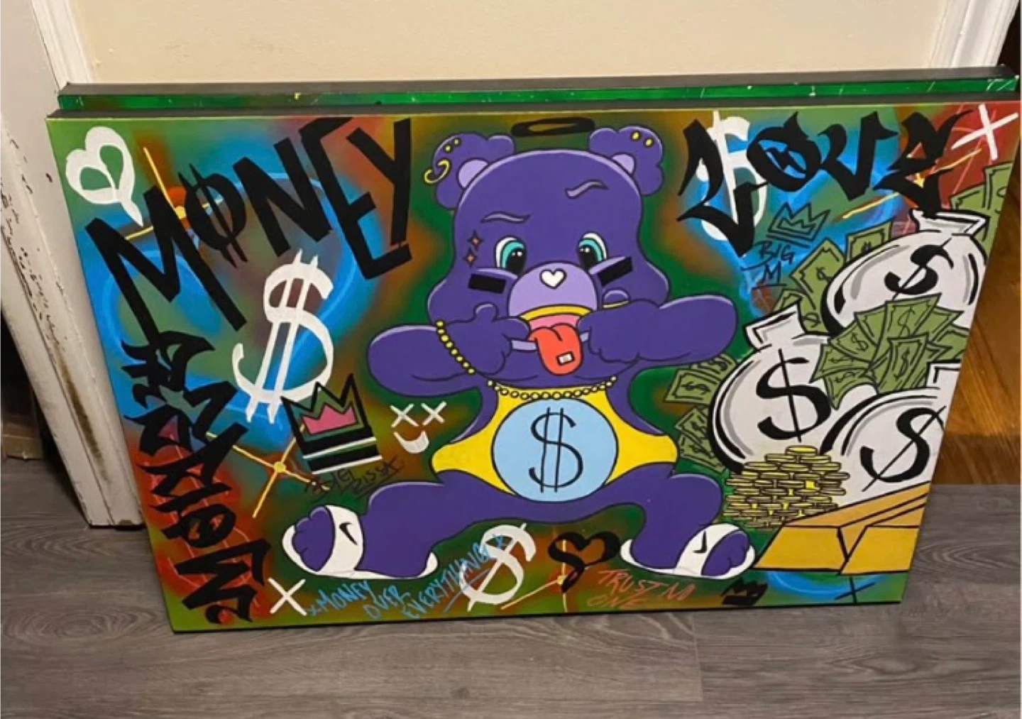 Unique custom painted art piece featuring a purple bear character with a money theme. The artwork incorporates vibrant colours and graffiti-style lettering. It's a striking statement piece for any space.