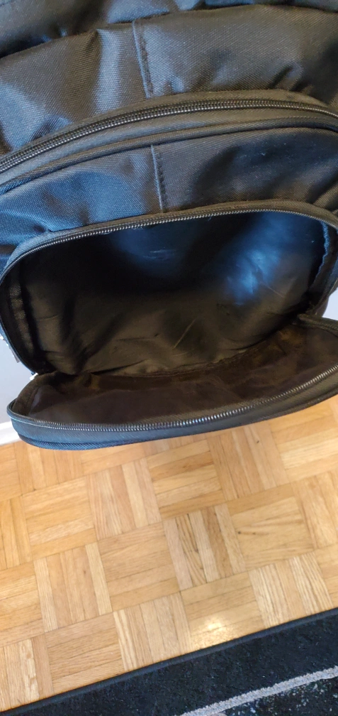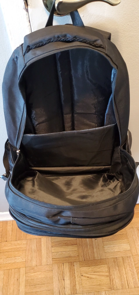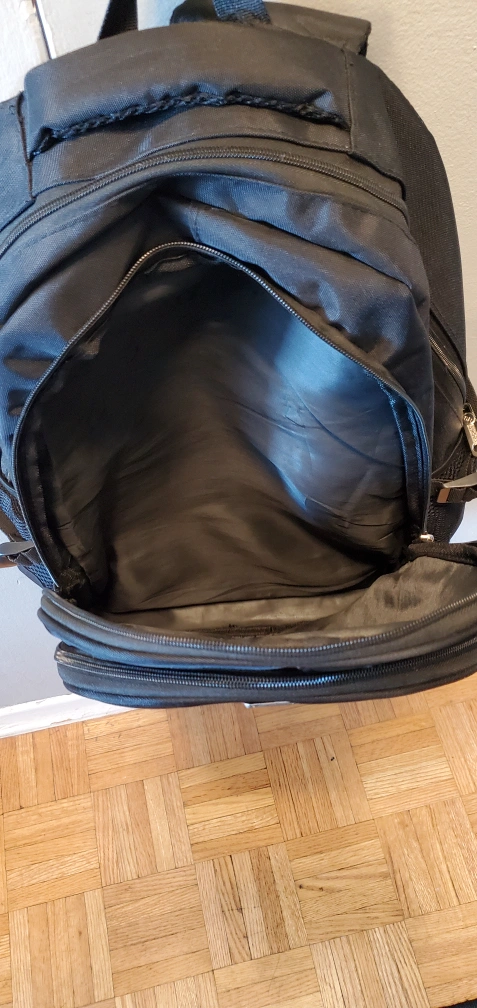Black backpack with multiple compartments and a zipper closure. Made of durable material.
