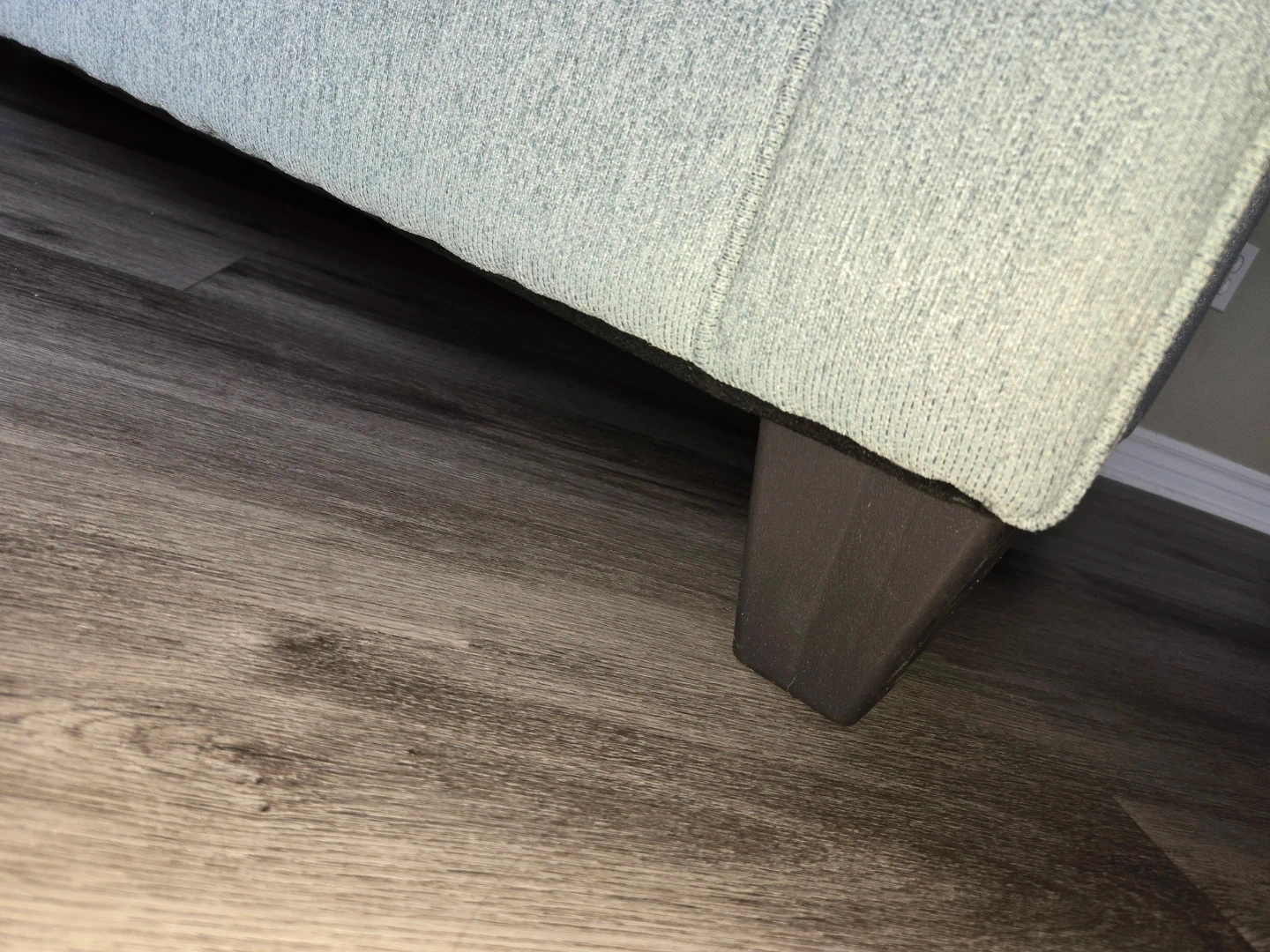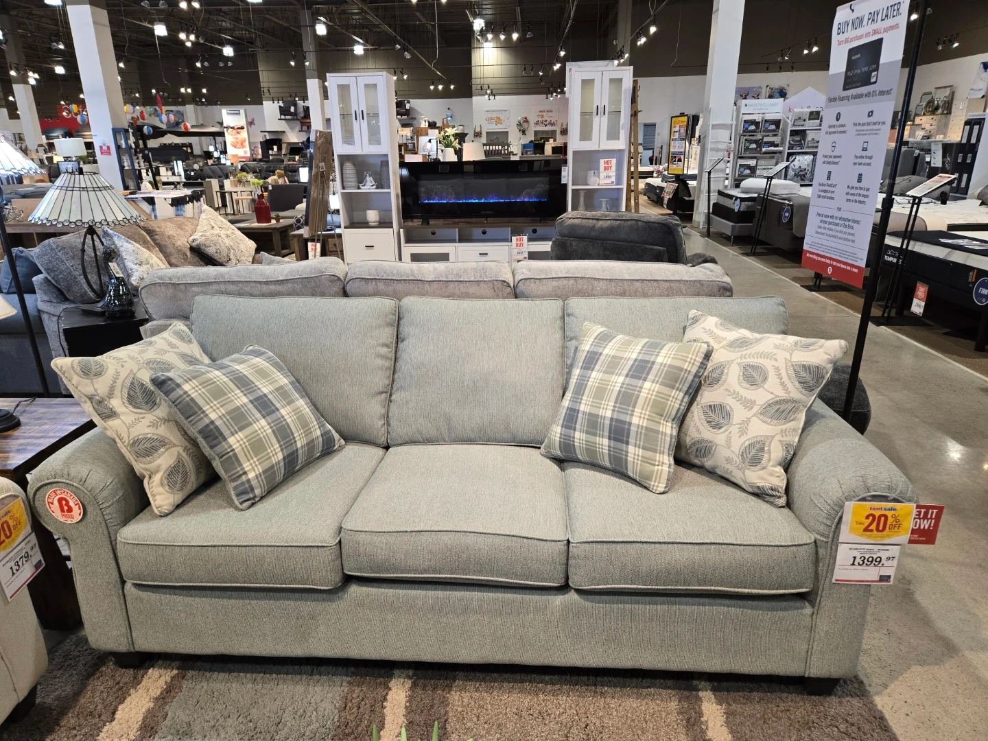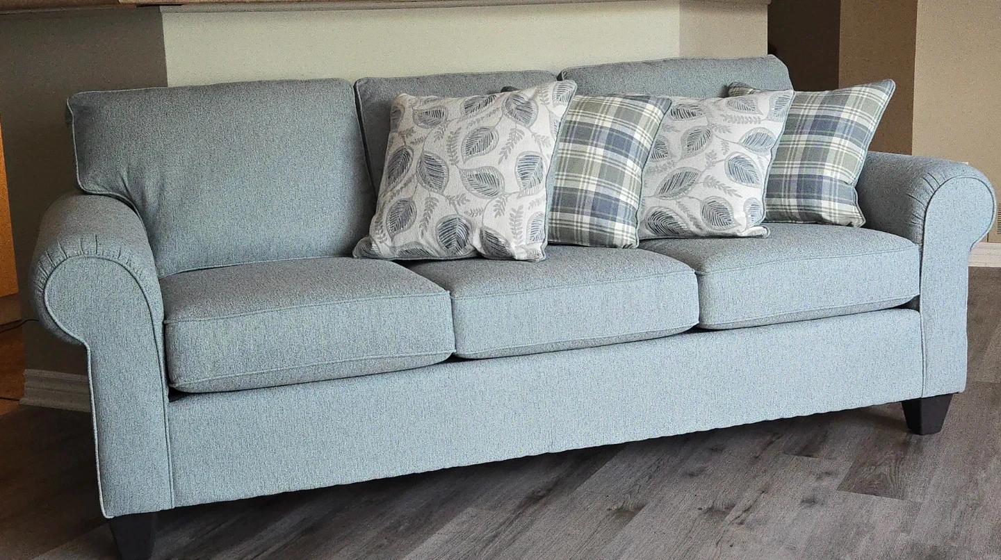 This blue fabric sofa comes with four decorative accent pillows. It's a comfortable three-seater couch with a classic design. The sofa's material appears to be a durable tweed or similar textured fabric. From Brick