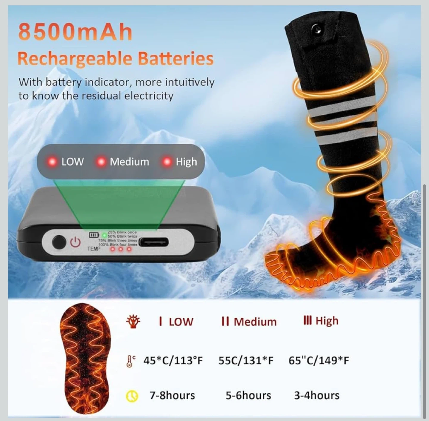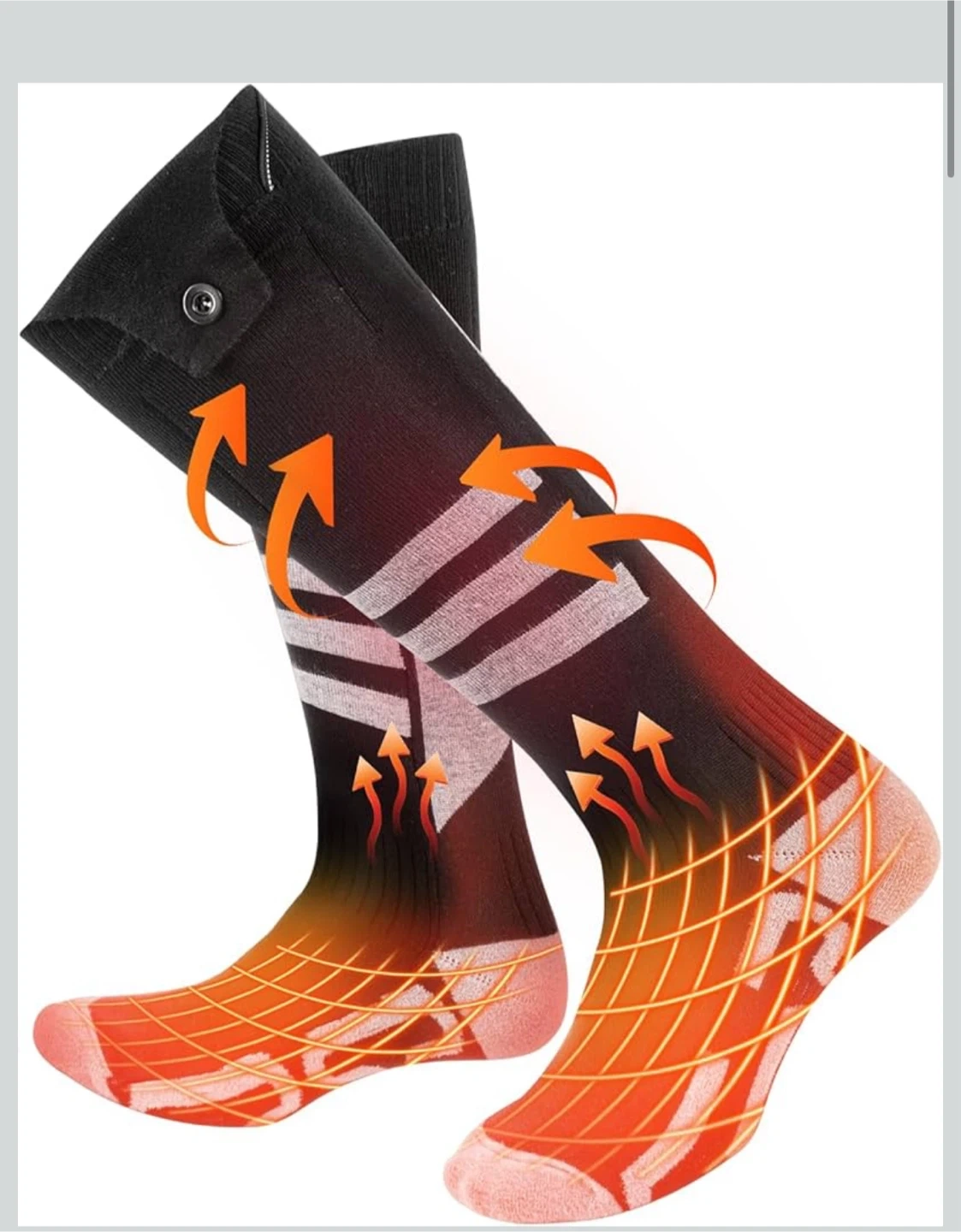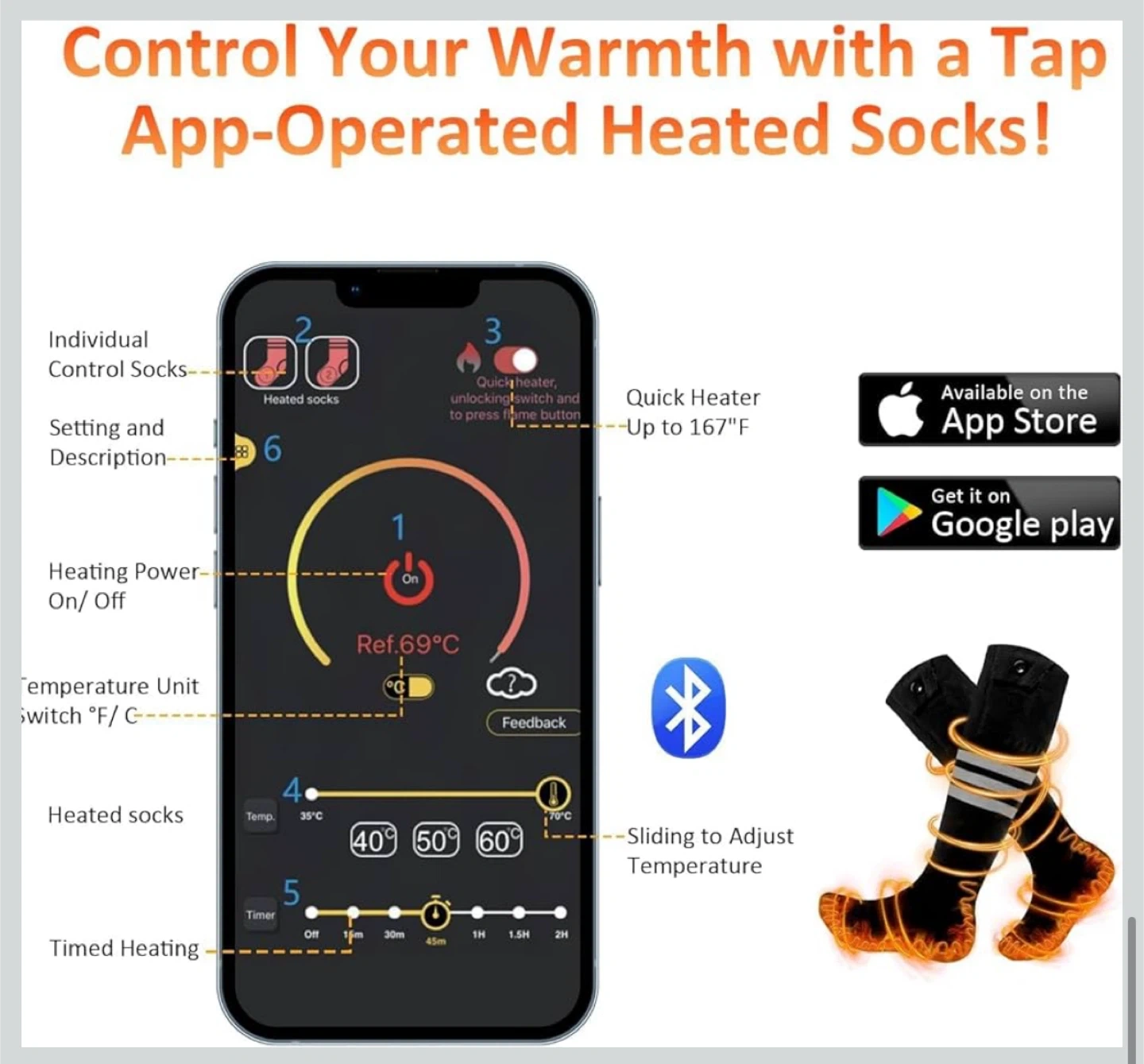 548Stay warm with these app-operated heated socks! They're free size for both men and women. Features include: - Individual control socks - Quick heater up to 167°F - Adjustable temperature - Timed heating - 8500mAh rechargeable batteries with battery indicator They're made of ultra-premium breathable cotton material and are machine washable for easy care