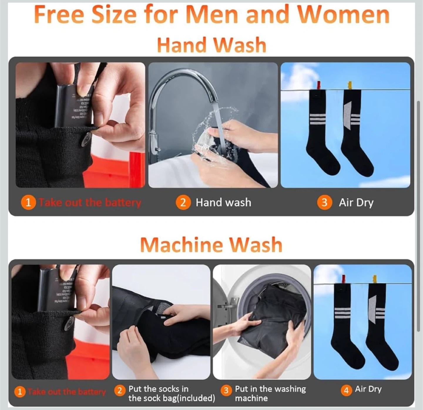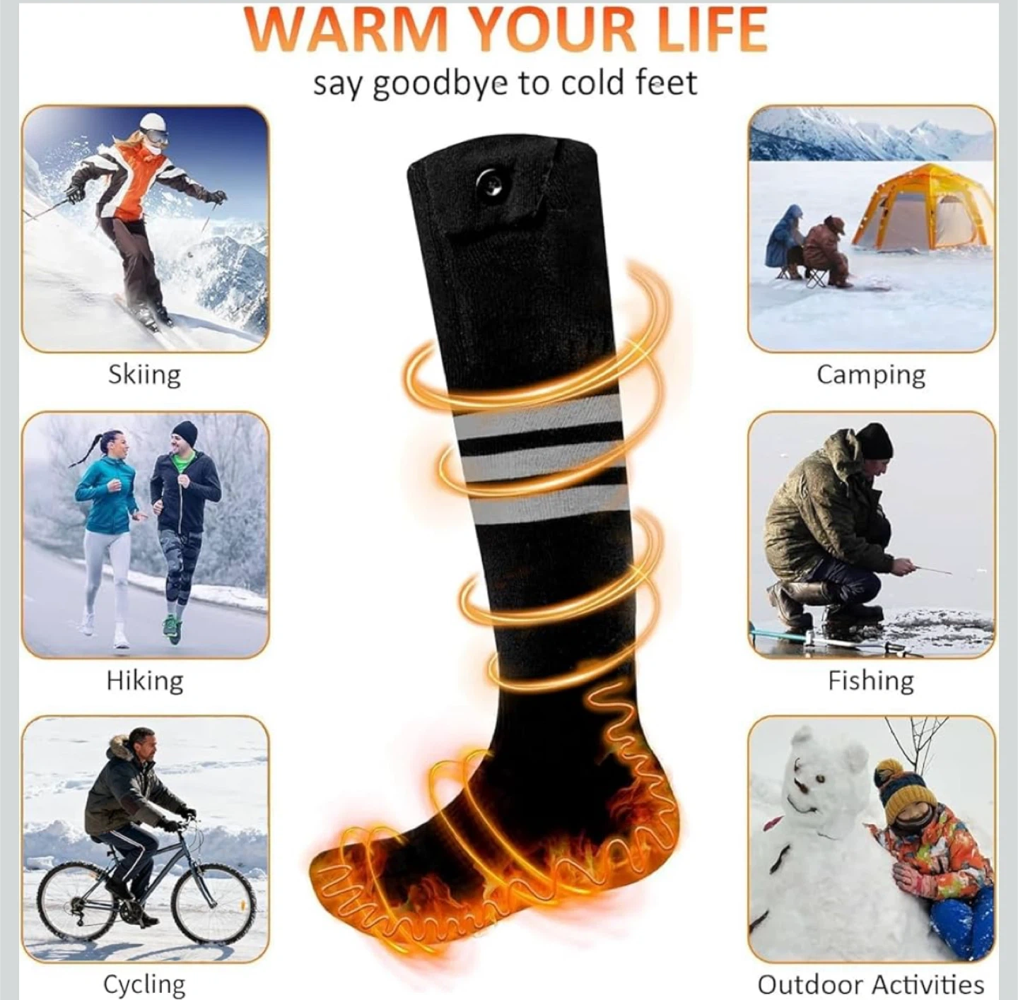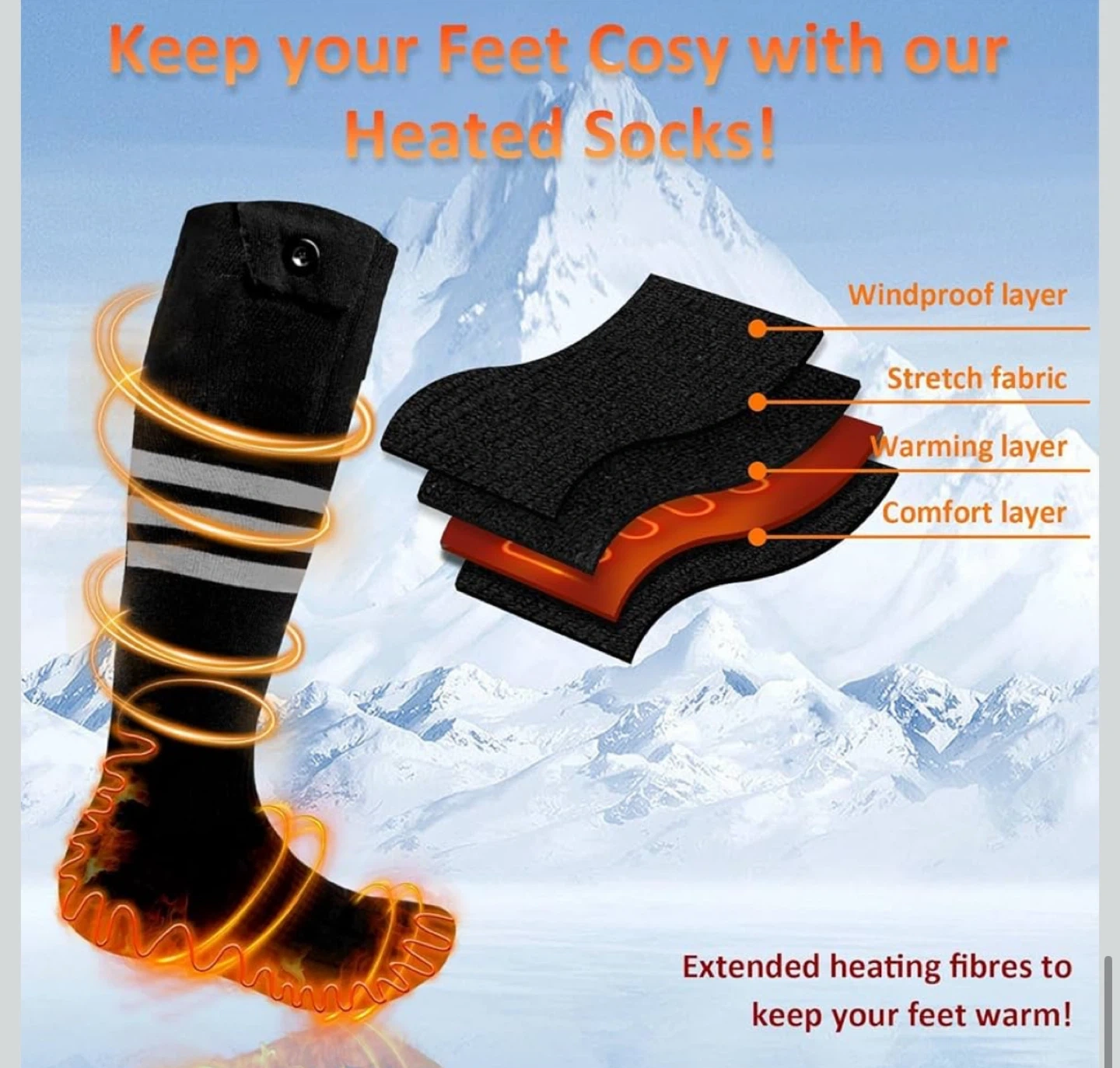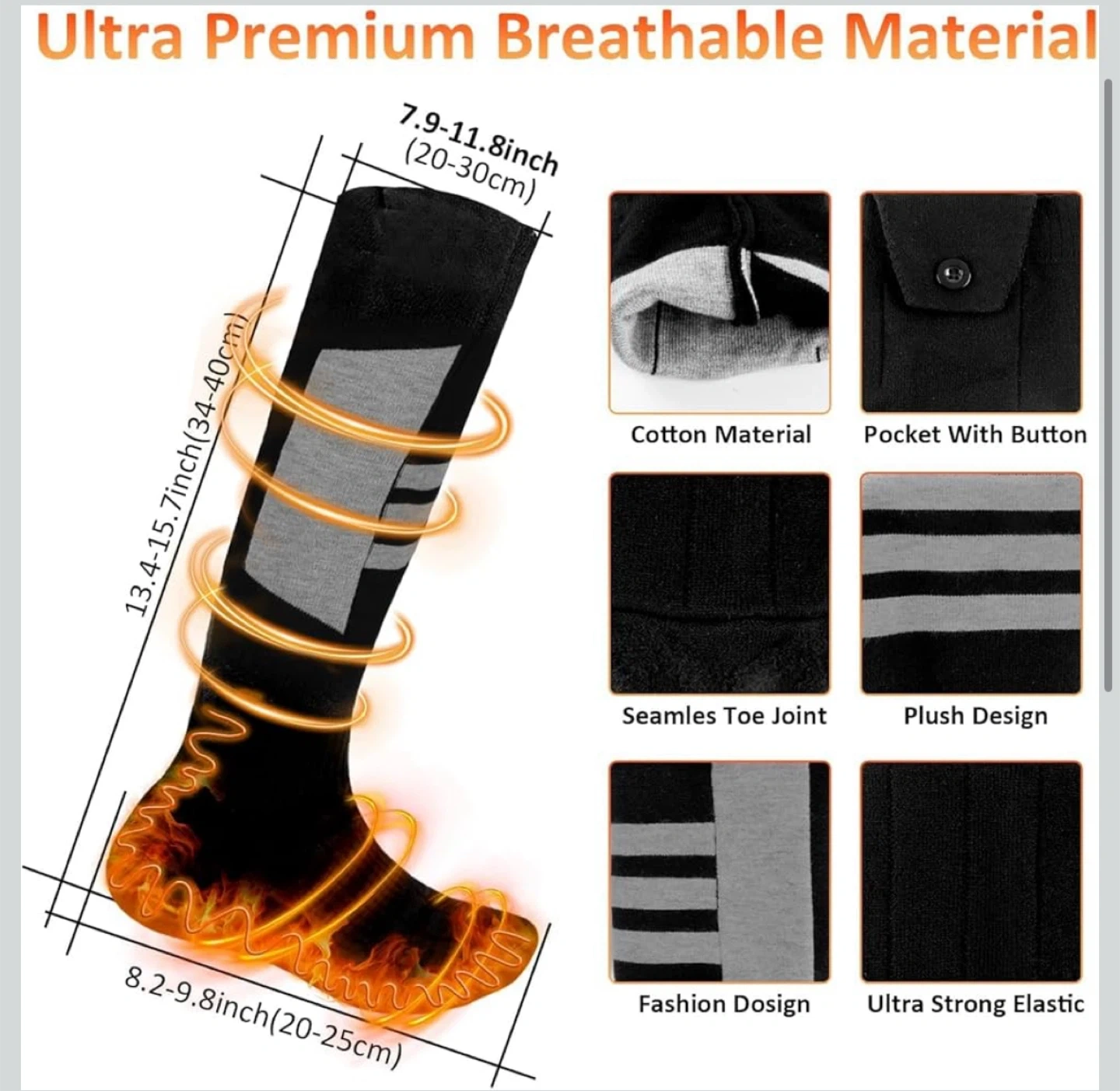 548Stay warm with these app-operated heated socks! They're free size for both men and women. Features include: - Individual control socks - Quick heater up to 167°F - Adjustable temperature - Timed heating - 8500mAh rechargeable batteries with battery indicator They're made of ultra-premium breathable cotton material and are machine washable for easy care