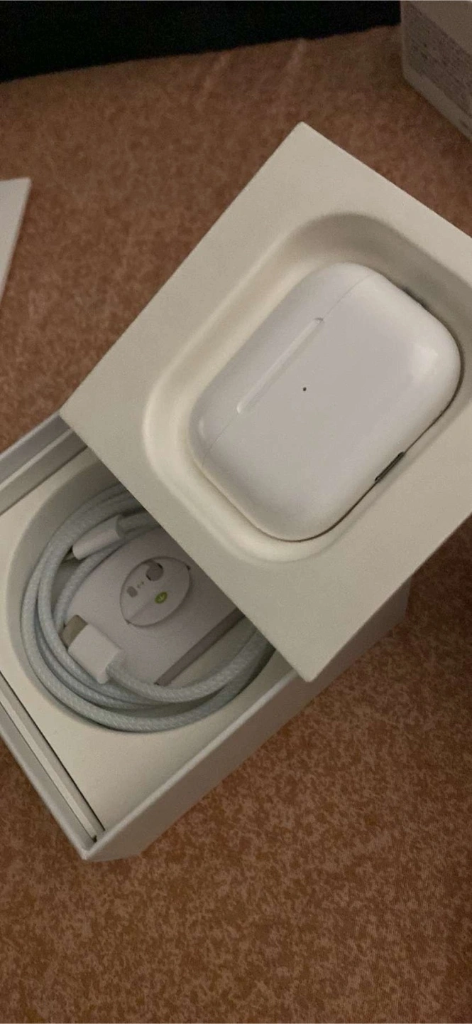 White wireless earbuds. Charging case included. Charger also included. Experience music in a whole new way with these. With apple warranty