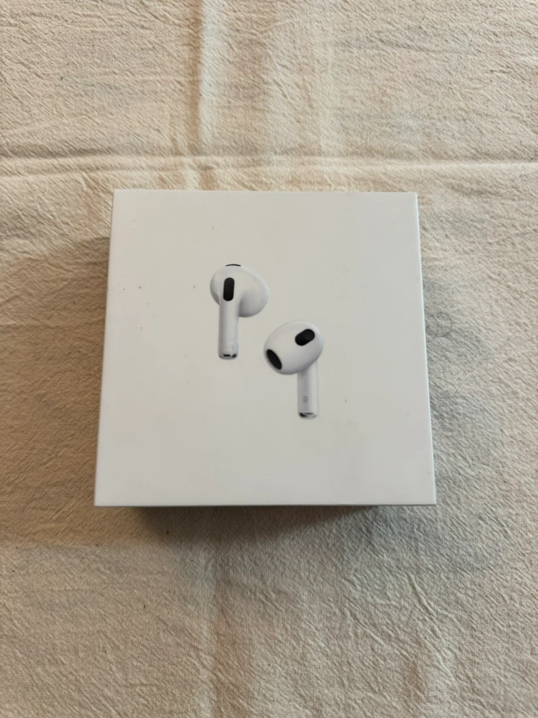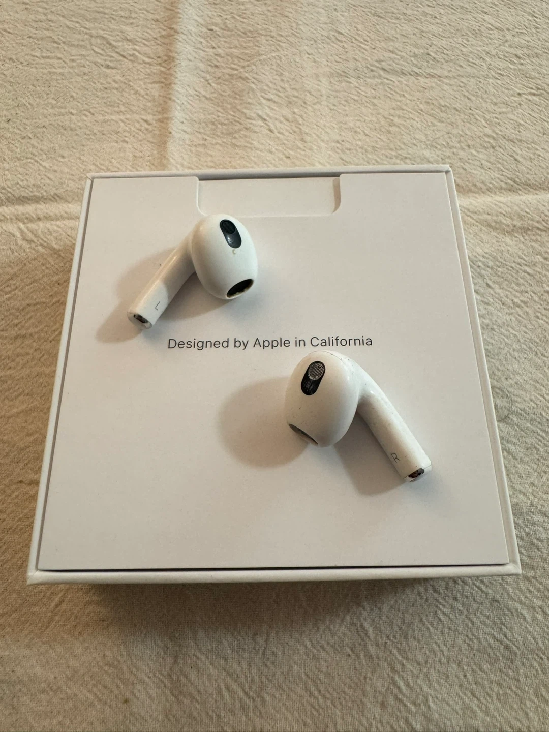 Selling a pair of Apple AirPods (3rd generation) that are in good/okay condition. They come with the original box. One fell in paint and is muffled, but can still hear out of it. probably have to replace or just use the other which is in perfect condition. Comes with ORIGINAL box. Does not come with charger.