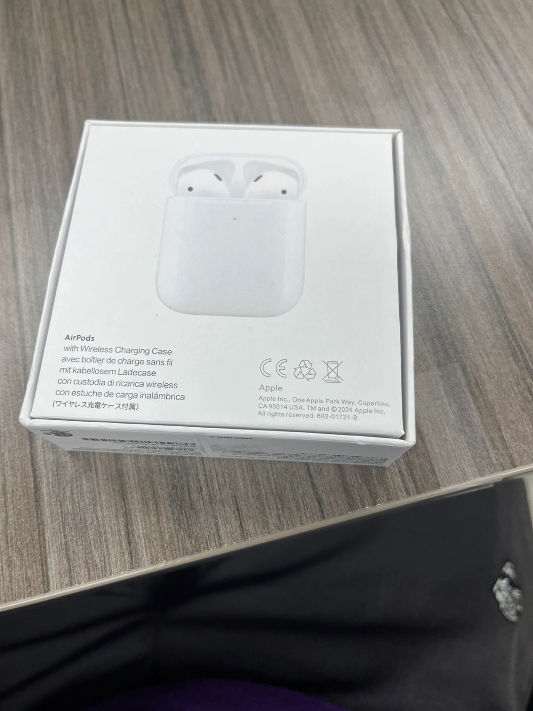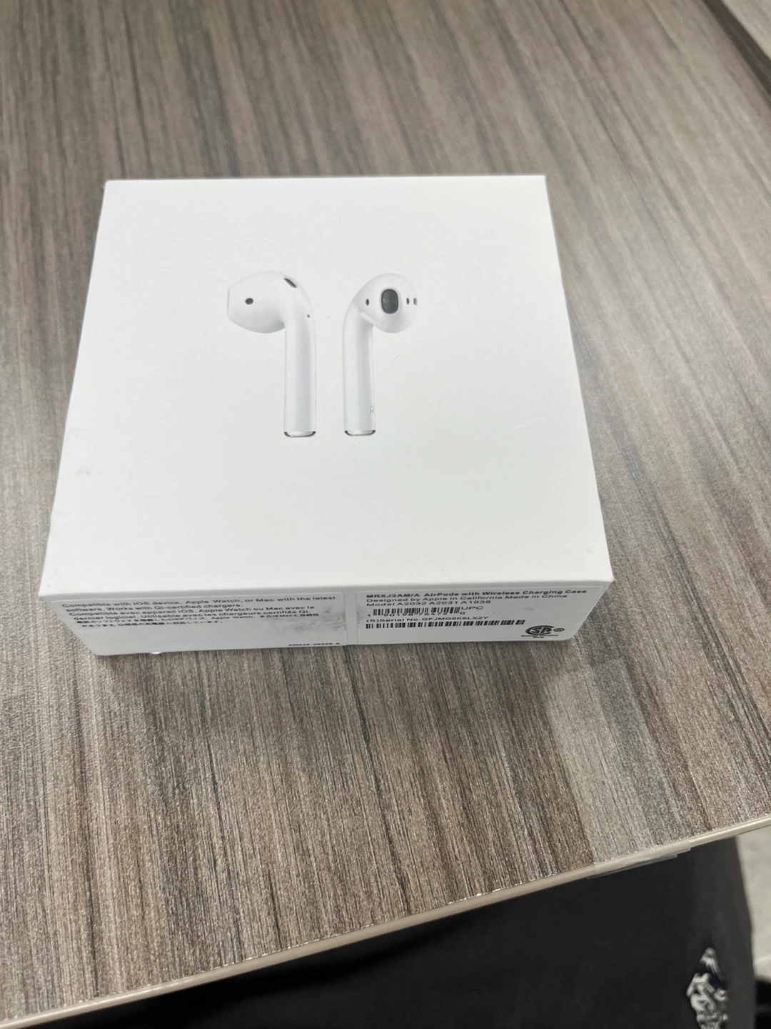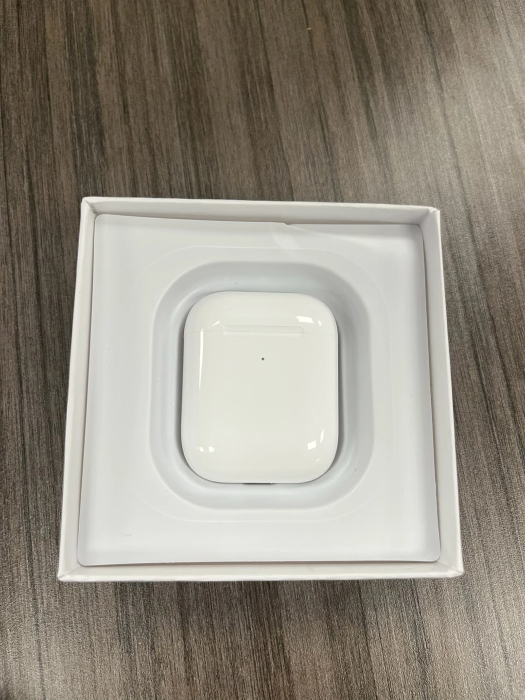 White box. AirPods with wireless charging case shown in the box. A perfect purchase to listen to your favourite music while you unwind after a long day.