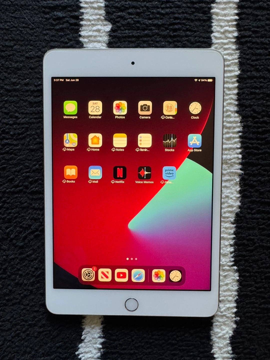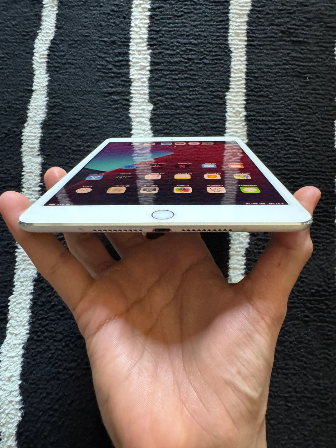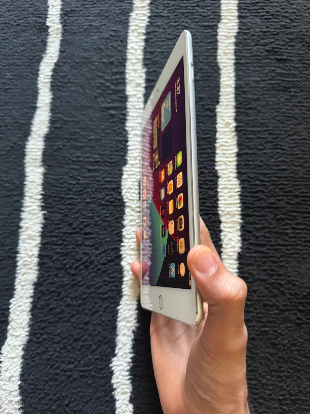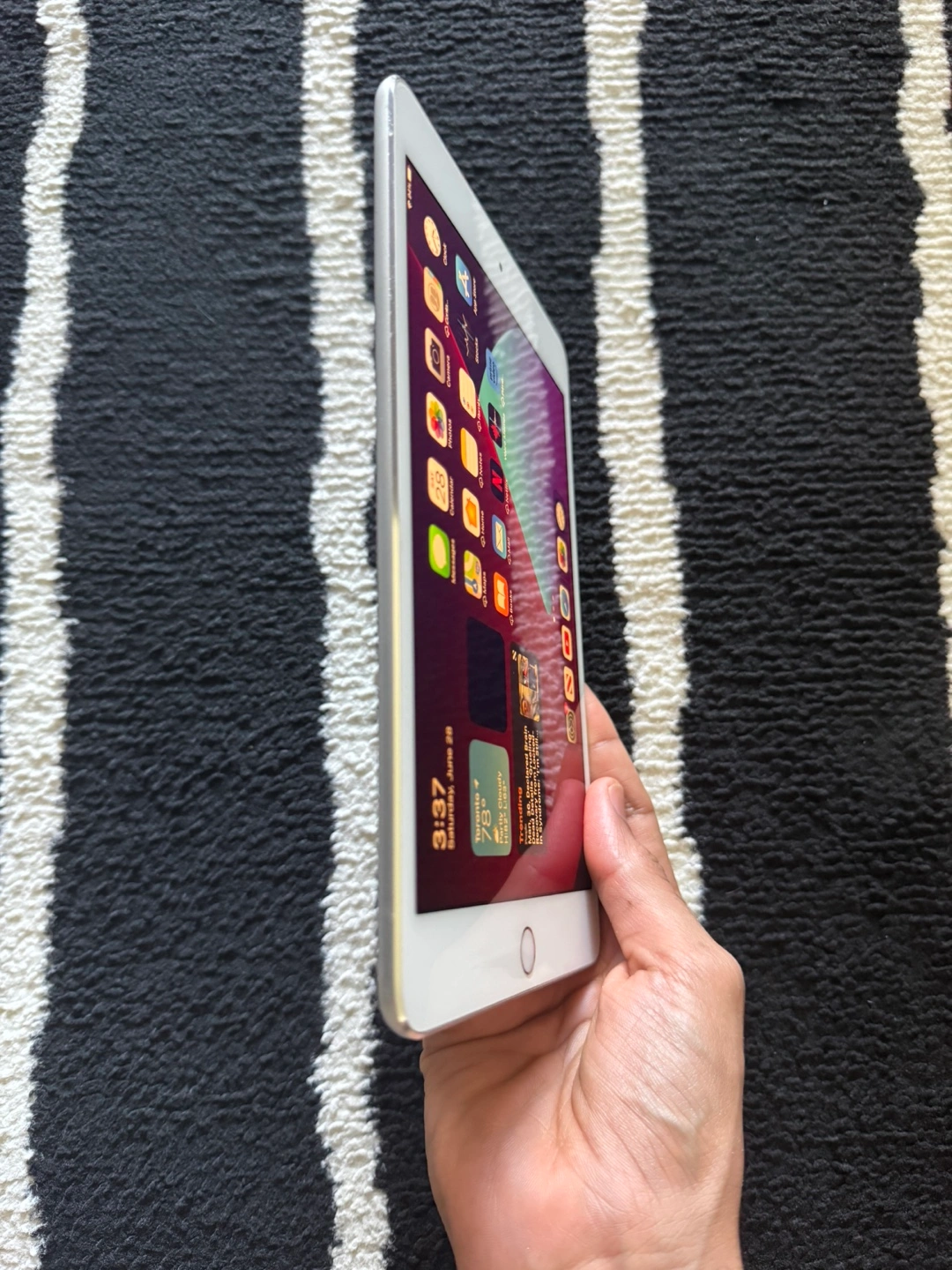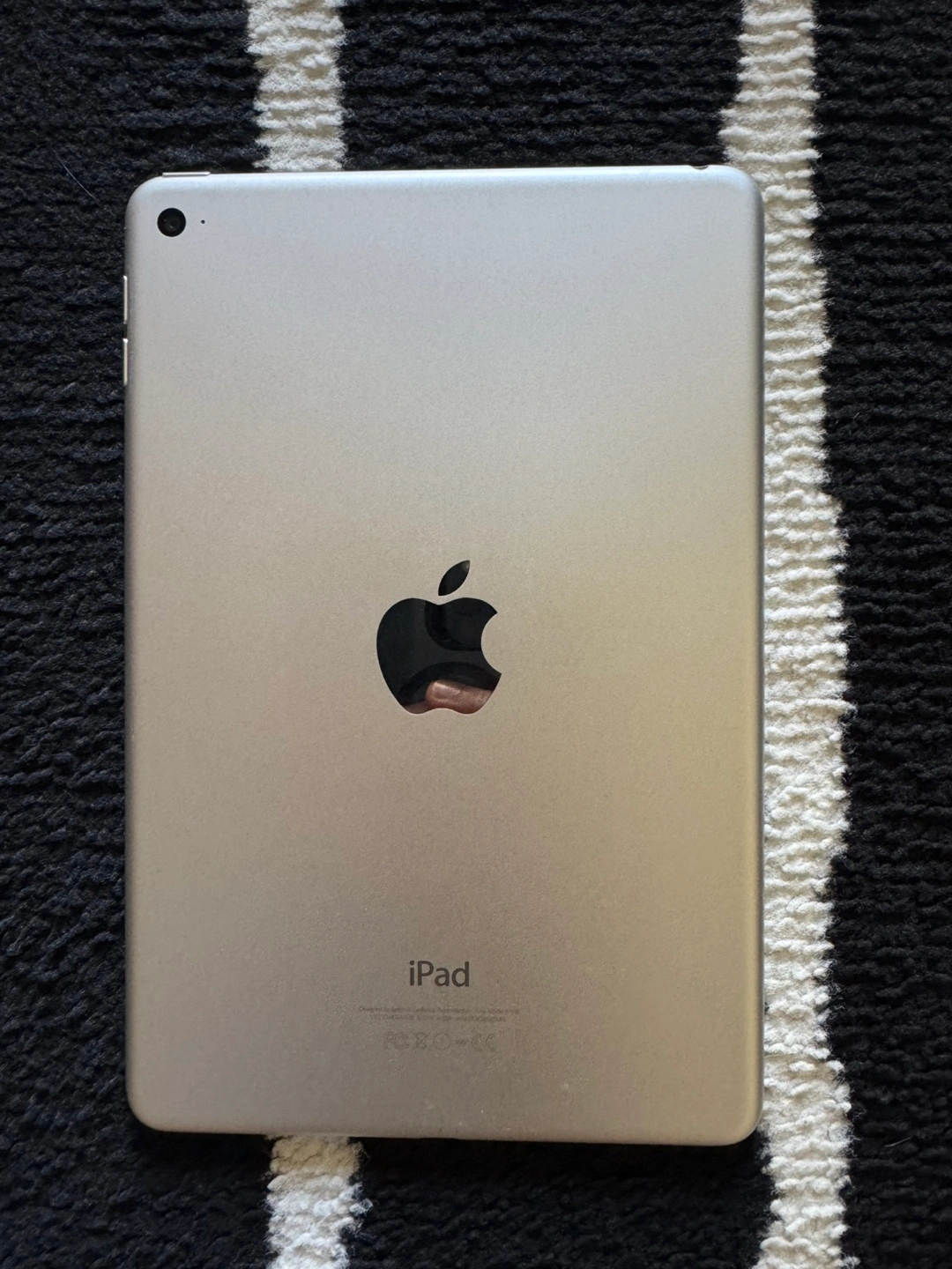 Selling a silver Apple iPad Mini 4. It's in great condition and ready for a new home! Perfect for reading, watching videos, or browsing on the go. It has 16 GB of memory and comes with the original charger cable and adapter.