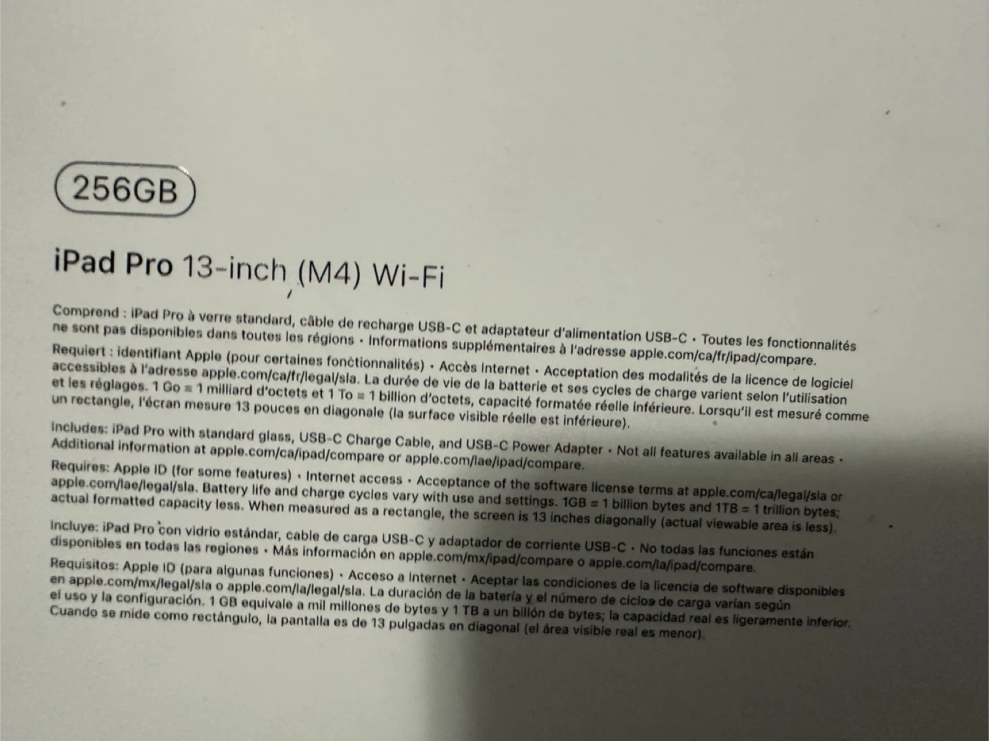 I'm selling a brand new, sealed Apple iPad Pro 13-inch M4 Wi-Fi with 256GB of storage in Space Black. This iPad is the latest model, offering top-of-the-line performance and a stunning display. Key Features: * 13-inch Display * 256GB Storage * M4 Chip * Wi-Fi * Space Black Finish