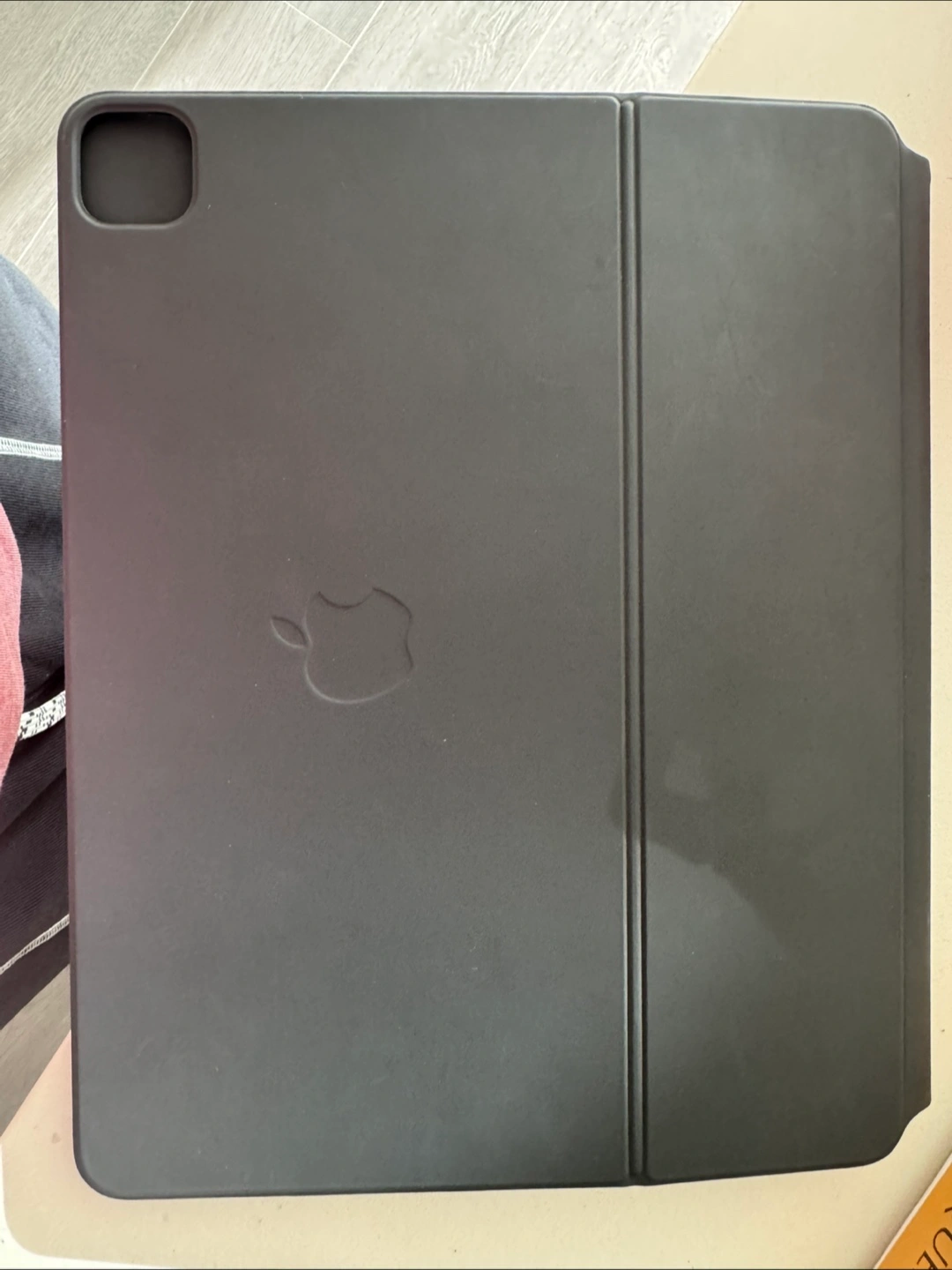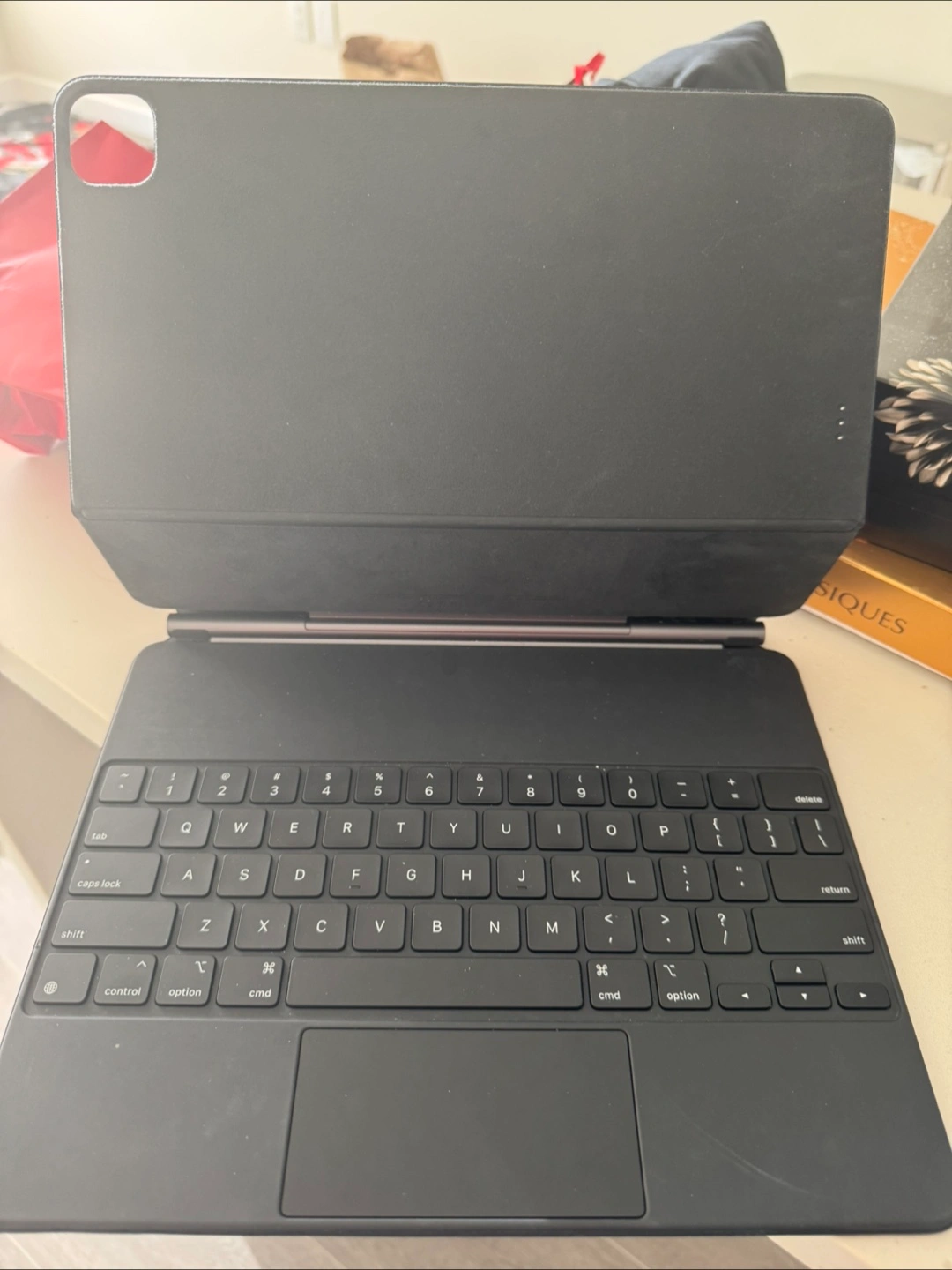 A keyboard case. Black, with a smooth exterior. Features a built-in keyboard and a built-in trackpad. A great way to work on your iPad comfortably. Pick up only
