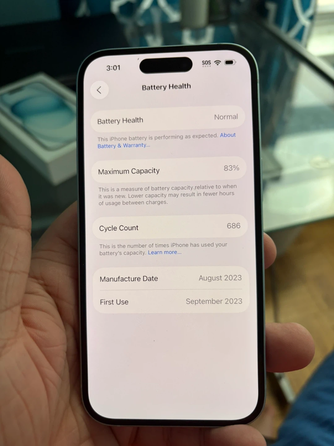 Selling an iPhone 15 in blue! The battery health is at 83%. It has been used, but is in good condition. Comes with the original box