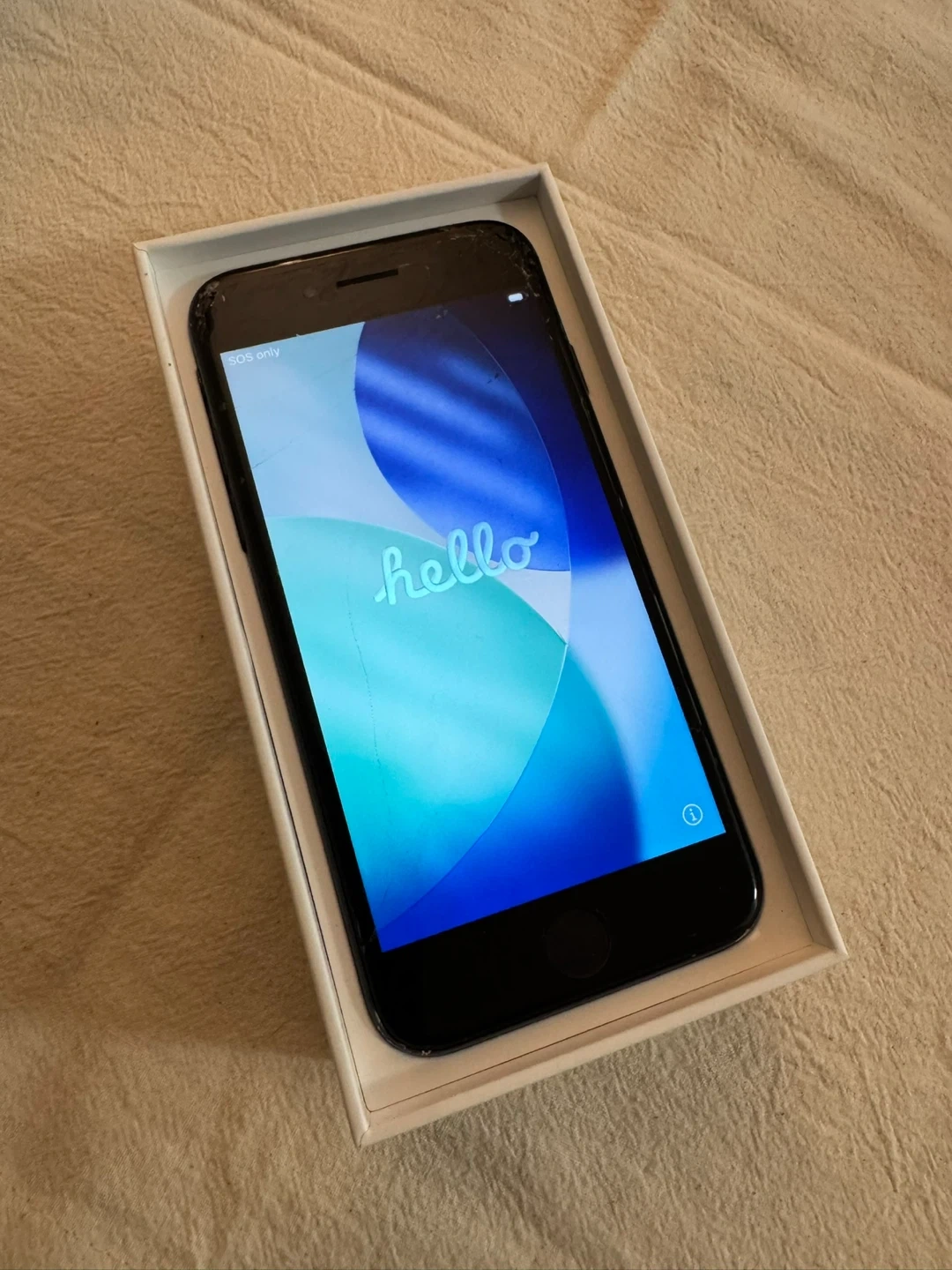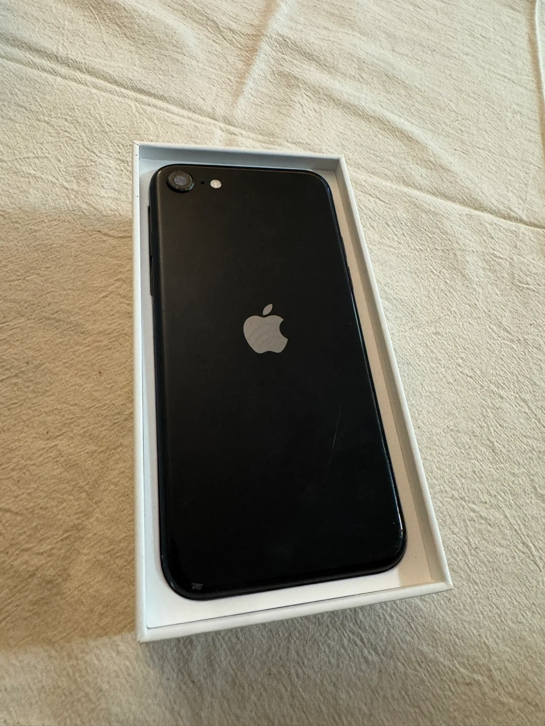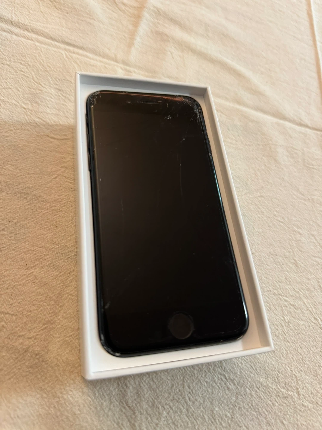 Selling a black Apple iPhone SE (2nd Generation). There are cracks on the screen and wear around the edges, as shown in the pictures. The camera glass is completely shattered but can still take pictures that you can see lol Comes with ORIGINAL box, brand new charger usbc - lightning cable that has never been used, no block though.