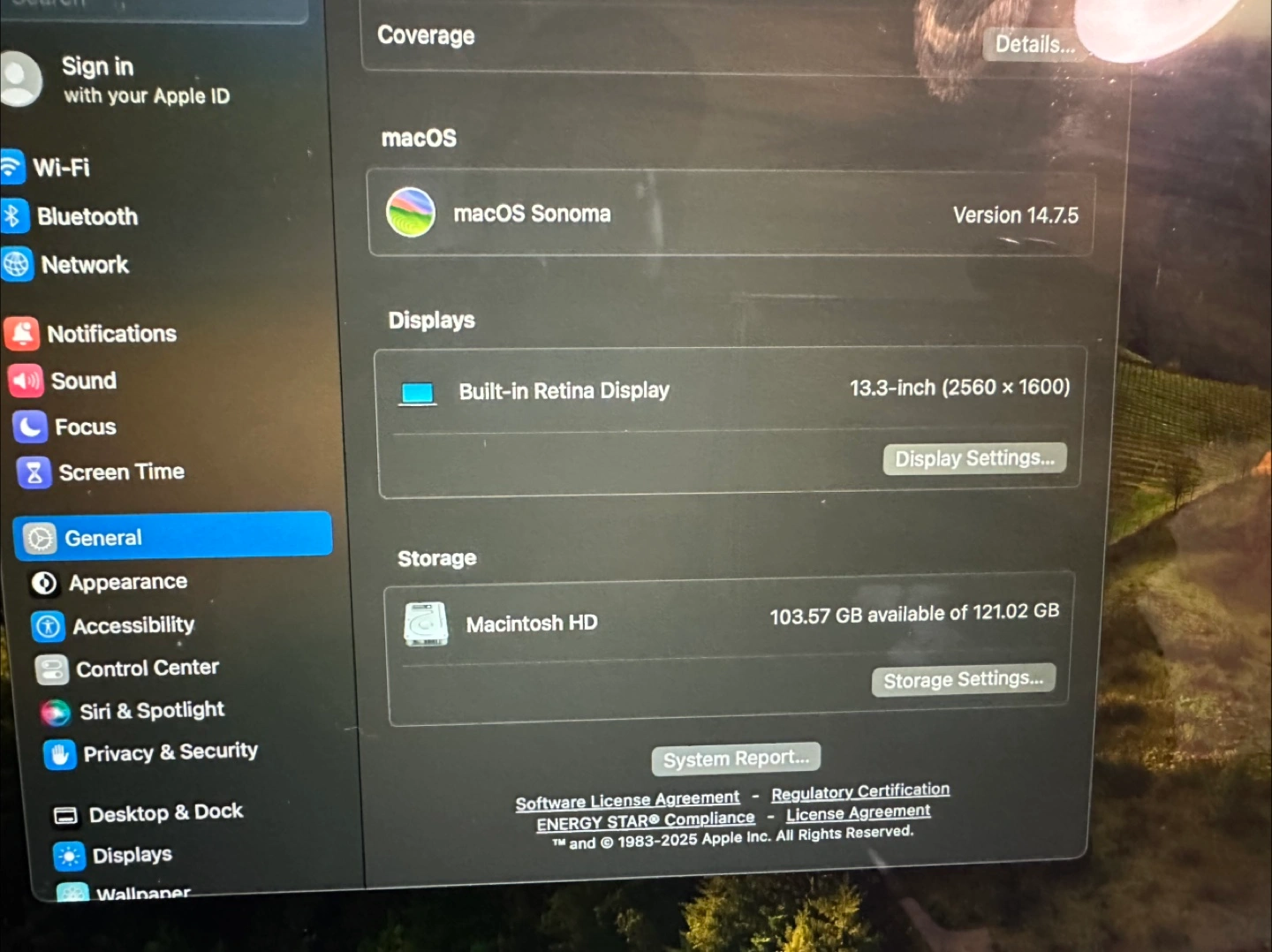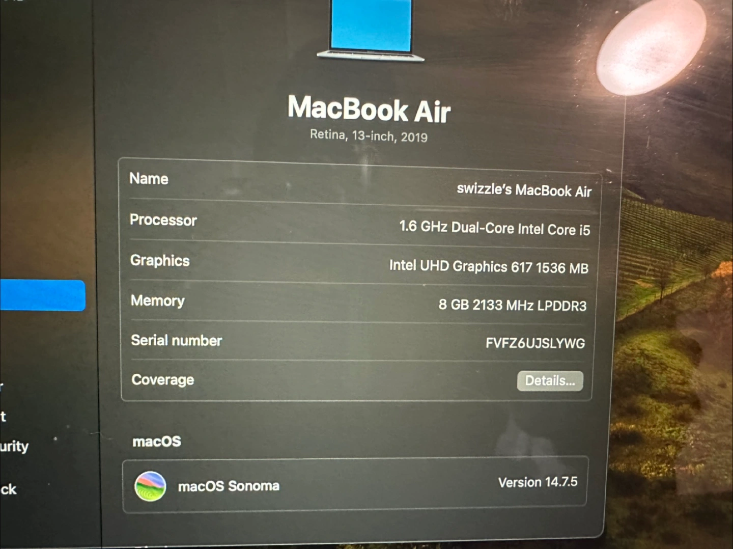 Selling a Macbook Air. It has a 13.3-inch built-in retina display. It is running macOS Sonoma Version 14.7.5. It has 8 GB of memory and a 1.6 GHz Dual-Core Intel Core i5 processor