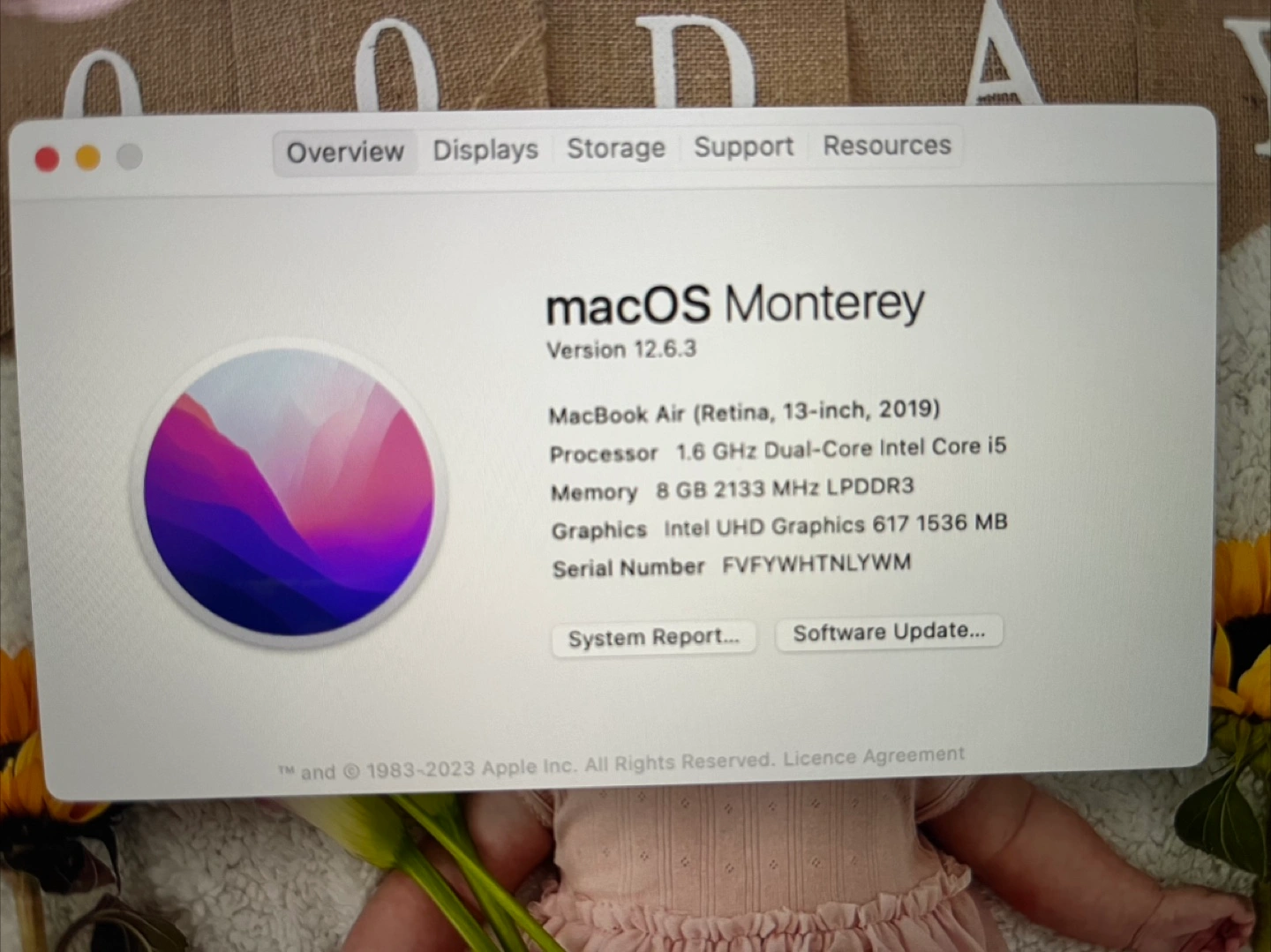 Selling my MacBook Air (Retina, 13-inch, 2019). It runs macOS Monterey Version 12.6.3. Changed a new monitor before Apple care end Can come with a computer case also in pink Specs: - Processor: 1.6 GHz Dual-Core Intel Core i5 - Memory: 8 GB 2133 MHz LPDDR3 - Graphics: Intel UHD Graphics 617 1536 MB