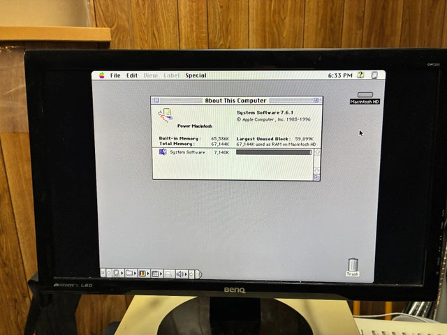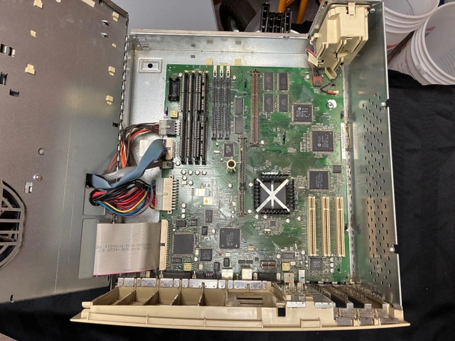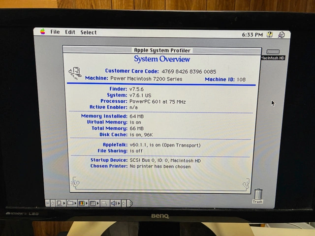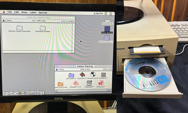 10Apple Power Macintosh 7200 (1995) -75MHz 601 PowerPC (PPC) CPU -64MB of RAM -running Mac System Software OS 7.6.1 -BlueSCSI V2 External SCSI Drive Emulator with a generic 8GB Micro SD Card (Booting to 2GB Macintosh Drive Image) -NO INTERNAL SCSI Hard Drive (Old one died). -Original Internal Apple SCSI CD-ROM Drive (I believe 4x speed) -Working 1.44MB Floppy Disk Drive -AppleDesign Keyboard -AppleDesign Mouse Working, but sold AS-IS due to its age. For collectors and retro enthusiast enjoyers. (Too old for modern daily tasks). Old Macs of this era all have issues with brittle plastics, and yellowing [expected]. This Mac is yellowing, expectantly (see pictures). There is a few areas of brittle plastic, but visually front the exterior it looks good, but a few parts inside have had nubs break off. The PCI retention plastic no longer hinges, but still works as intended when placed into place. PRAM battery has been removed, this is preventative maintenance. PRAM battery is not needed, but settings like time & date, and volume will be forgotten when unplugged. PRAM batteries have a tendency to leak quickly, without warning, and damage logic boards. Thankfully this has not happened, and the board is in great shape, no leaks, no damage. LCD MONITOR NOT INCLUDED, only used for testing. The Floppy Disk and CD-ROM (SimCity) used for testing purposes are NOT INCLUDED. Only Macintosh, Keyboard, Mouse, Cables, Macintosh Video to VGA Adapter, BlueSCSI, and 8GB microSD Card are included. $200 OBO. I don't drive; Pickup only. I will not ship these items. Cash or e-Transfer only. No trades.