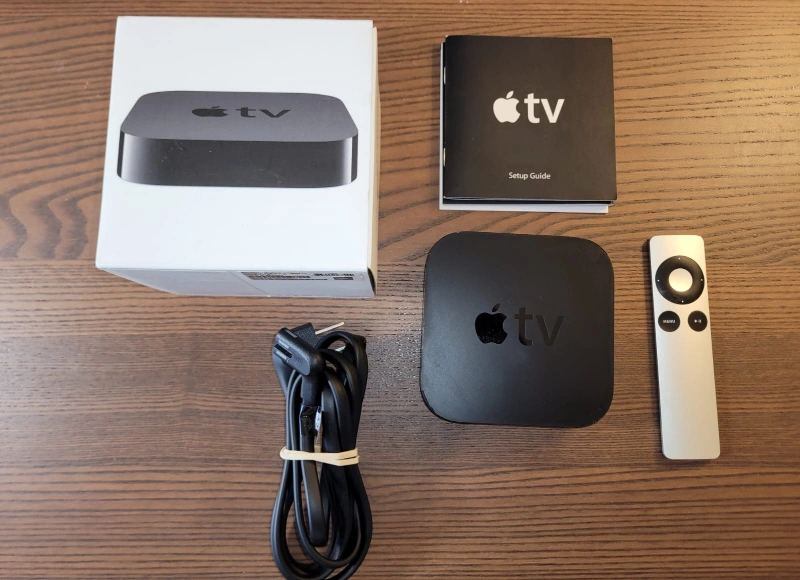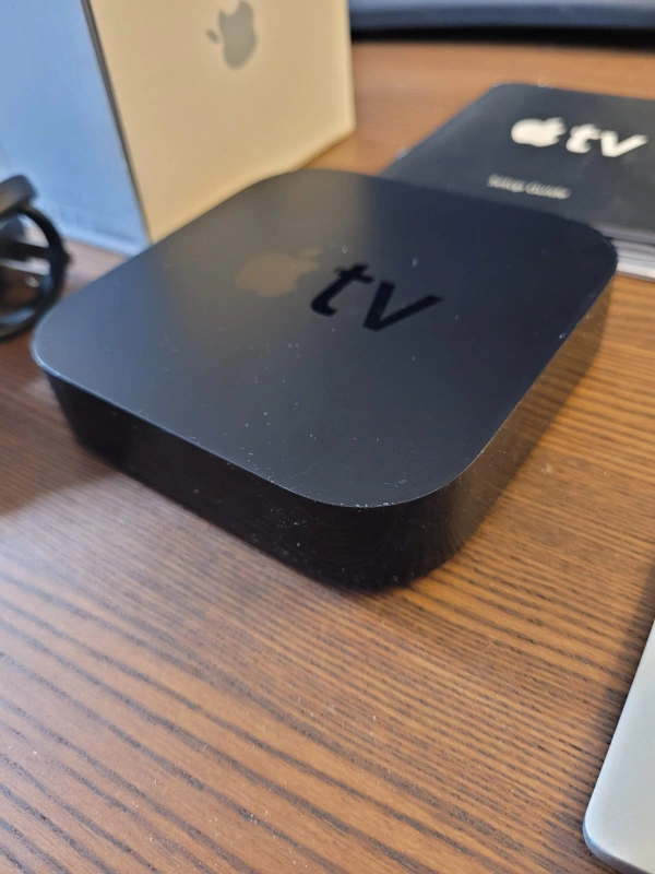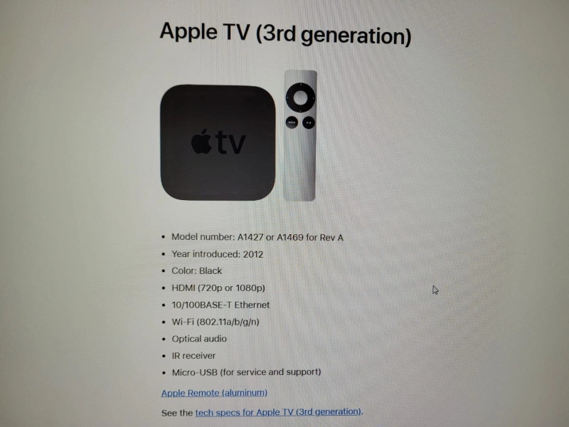 222Third generation Apple TV in excellent condition Model number: A1427 or A1469 for Rev A Year introduced: 2012 Color: Black HDMI (1080p) 10/100BASE-T Ethernet Wi-Fi (802.11a/b/g/n) Optical audio IR receiver Micro-USB (for service and support) Apple Remote (aluminum)
