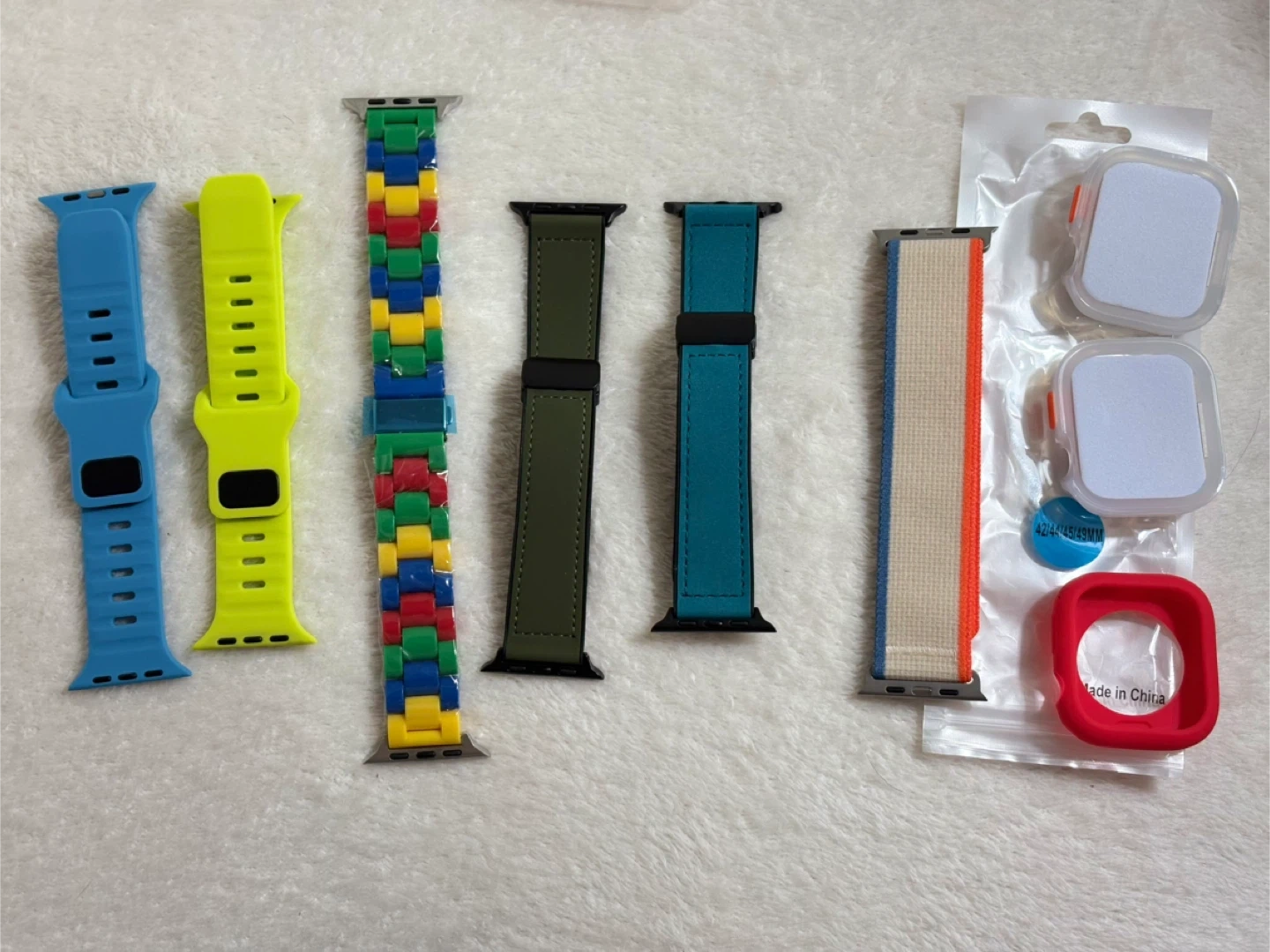 Selling a variety of Apple Watch bands and cases! Compatible with 42mm, 44mm, 45mm, 46,mm and 49mm Apple Watches. There are several colours and styles to choose from, including silicone, leather, and woven options. Also includes some protective cases.