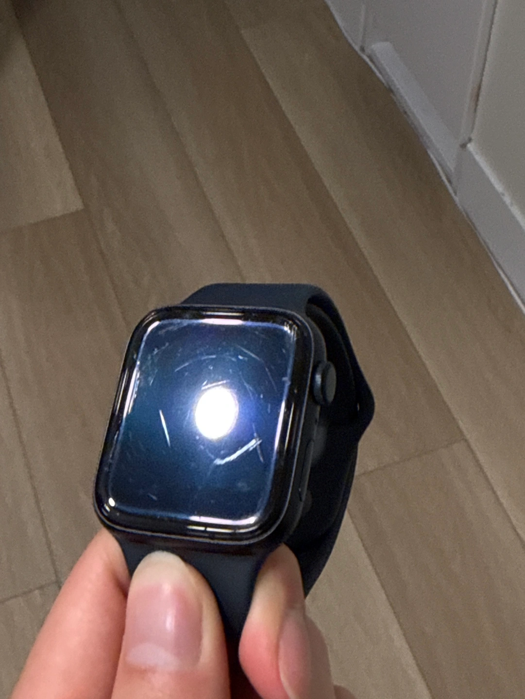 18Pre-owned Apple Watch SE 2. Space grey aluminium case with a navy sport band. Scratched screen. Original charging wire available but no box.