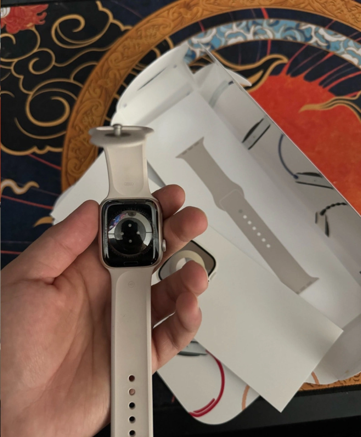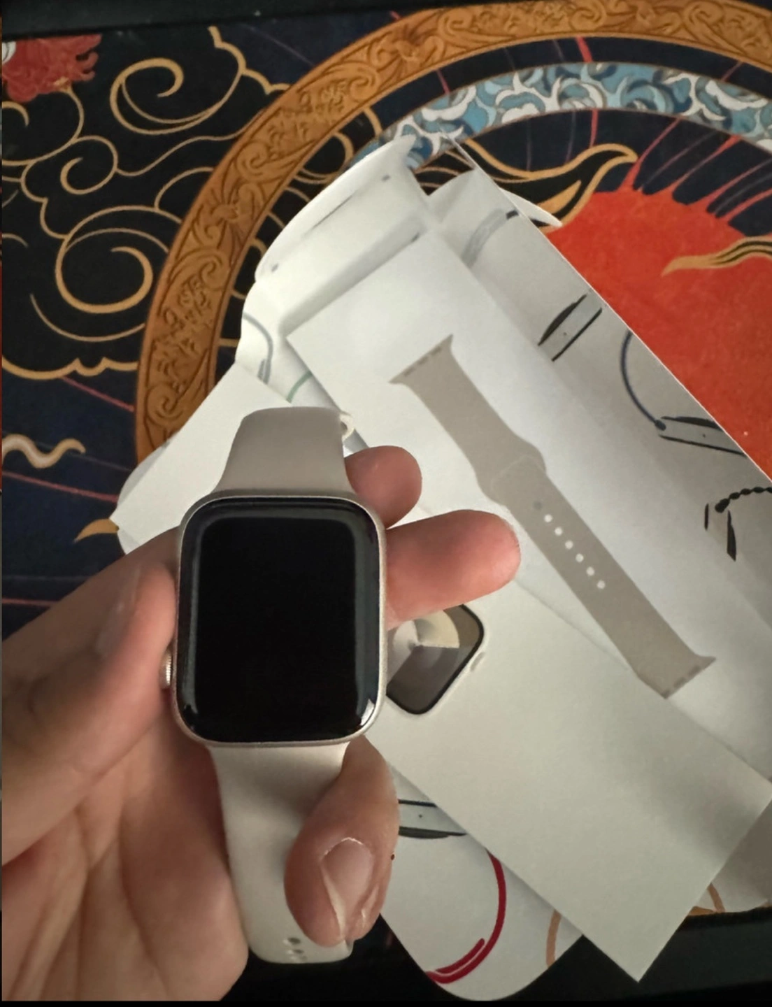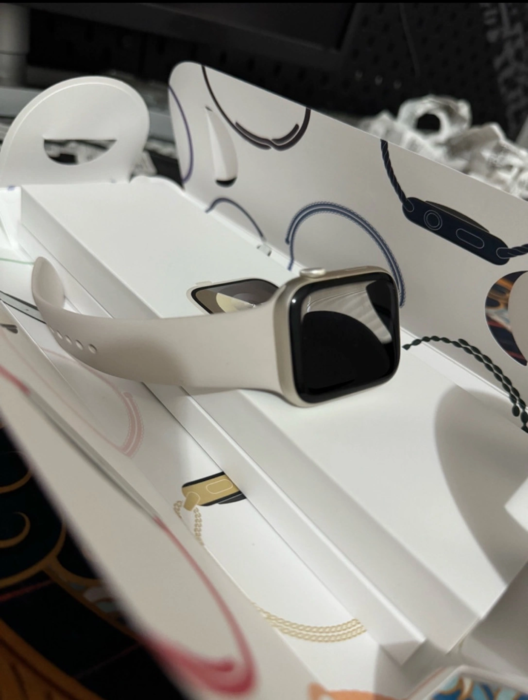 Apple Watch Series 9. Gold Aluminium case. Cloud White Sport Band. Comes with original box and packaging. Pre-owned.