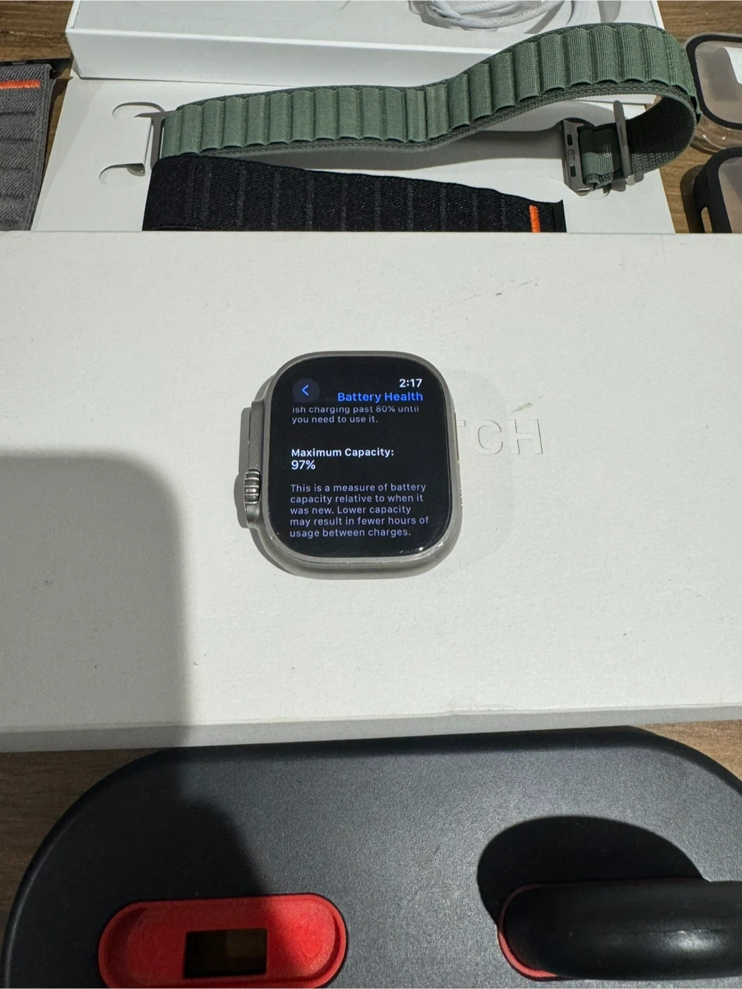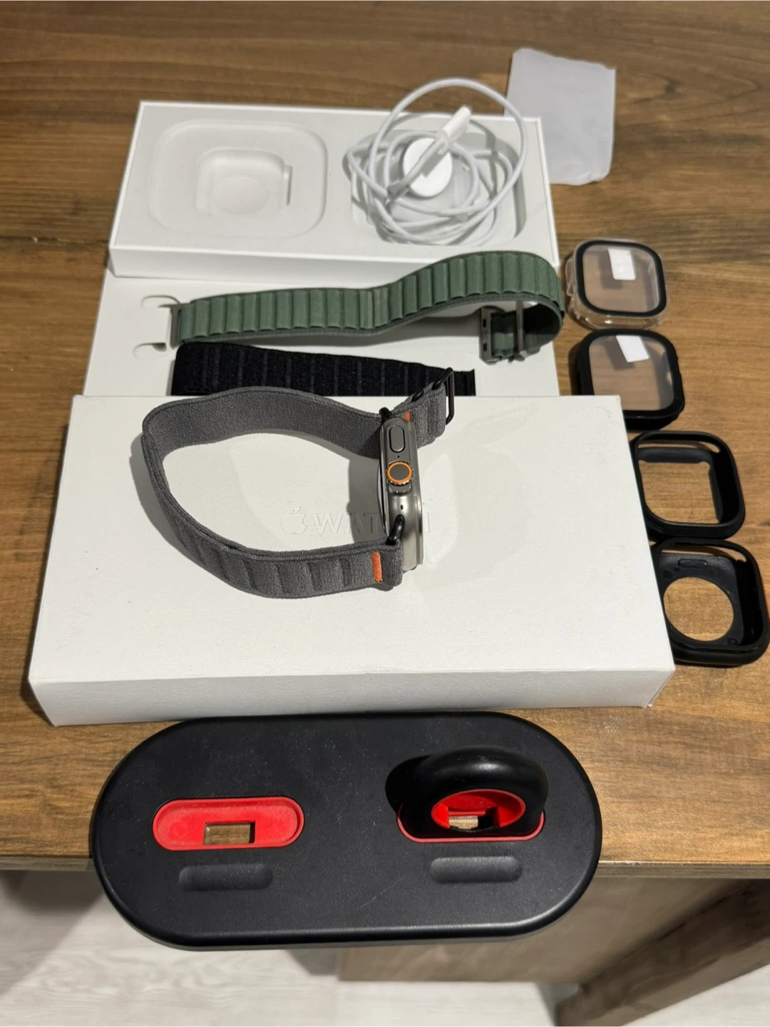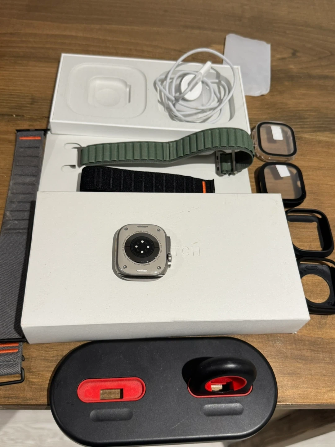 Selling my Apple Watch Ultra! It comes with the original box and all the accessories you see in the pictures. This watch is in great condition and ready for a new owner. Includes charger, multiple bands, and protective cases. A great deal for anyone looking for a rugged and reliable smartwatch! Battery health is at 97%. I had it for 2 years so apple warranty is done.