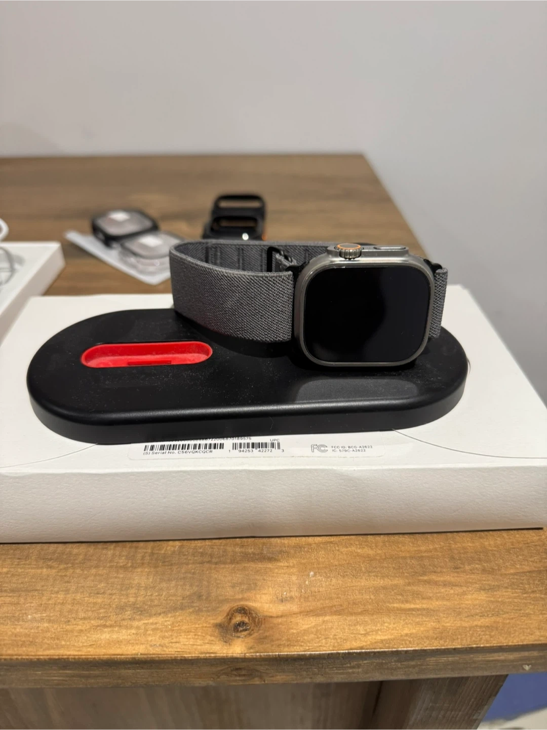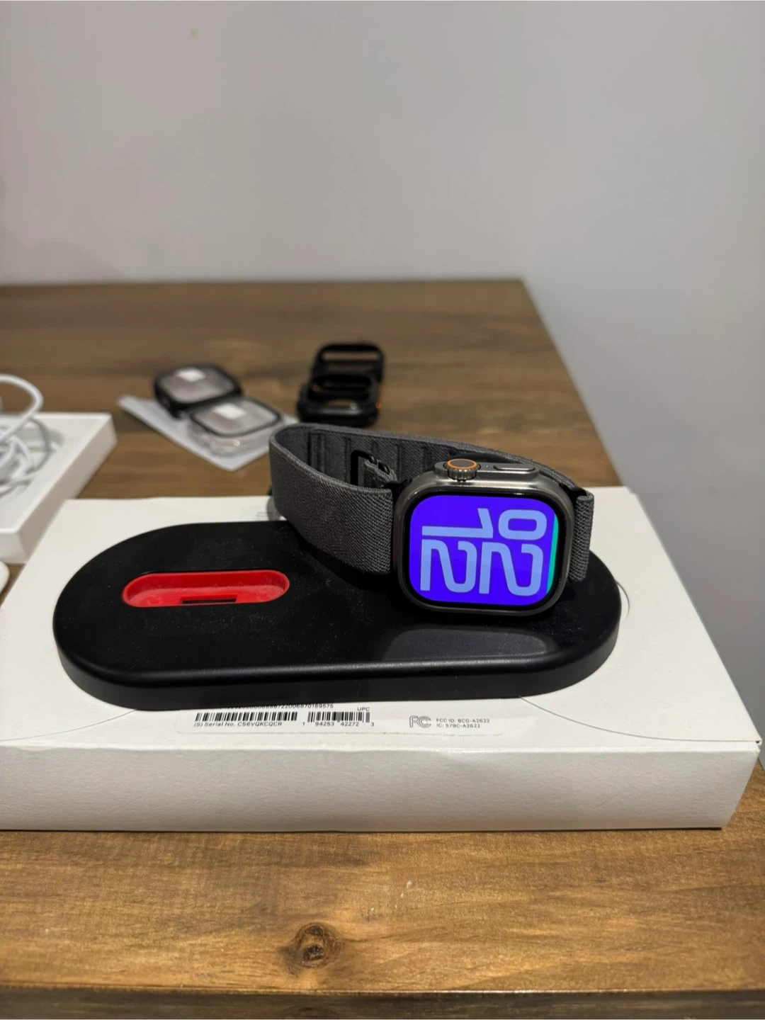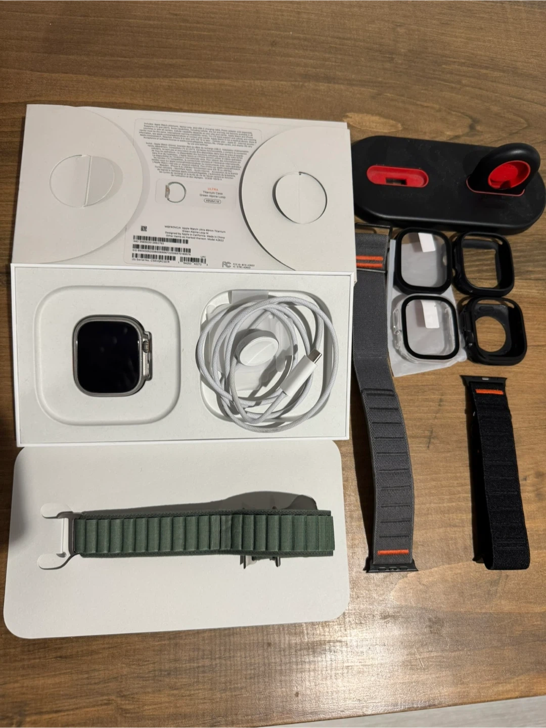 Selling my Apple Watch Ultra! It comes with the original box and all the accessories you see in the pictures. This watch is in great condition and ready for a new owner. Includes charger, multiple bands, and protective cases. A great deal for anyone looking for a rugged and reliable smartwatch! Battery health is at 97%. I had it for 2 years so apple warranty is done.