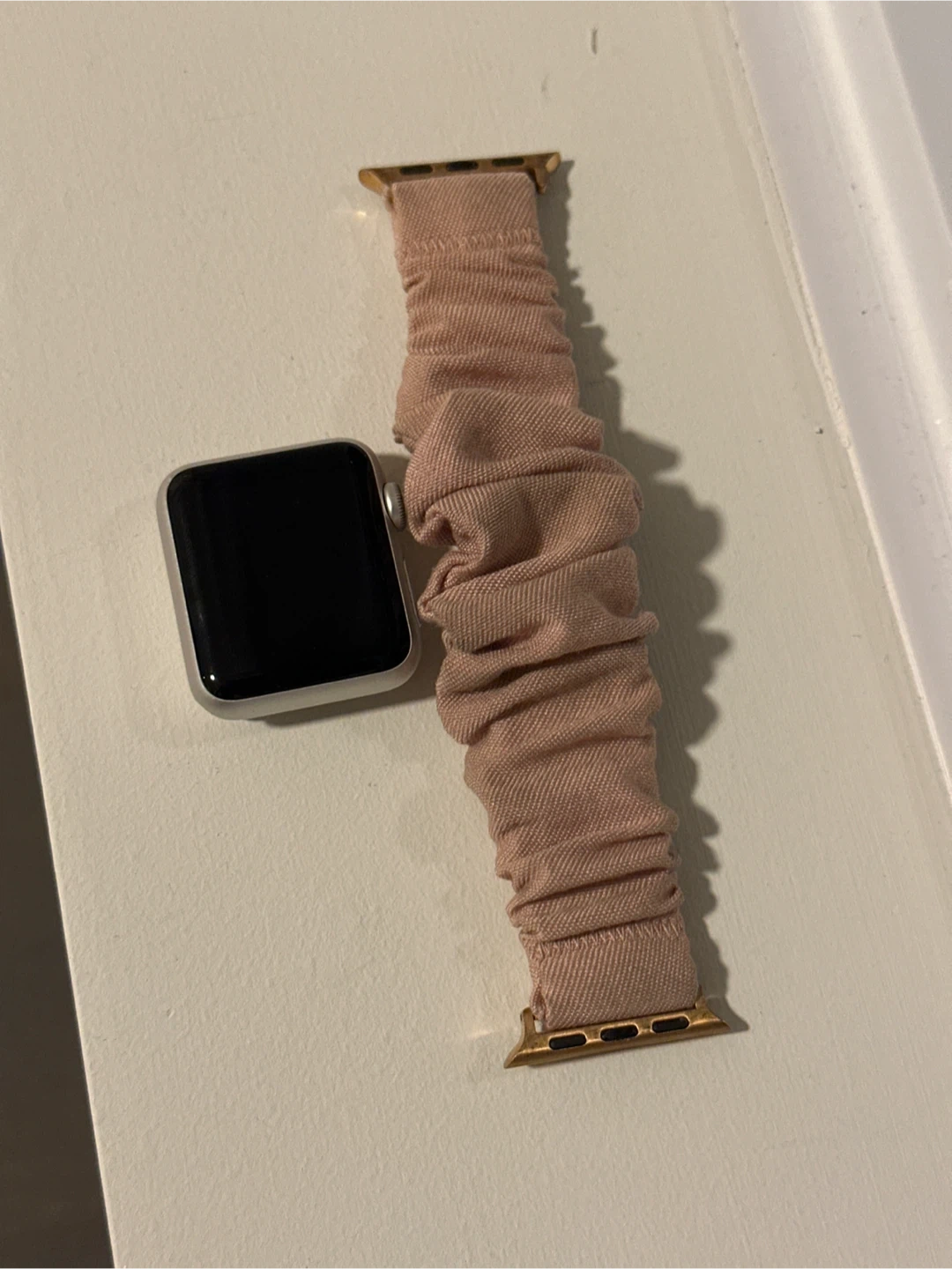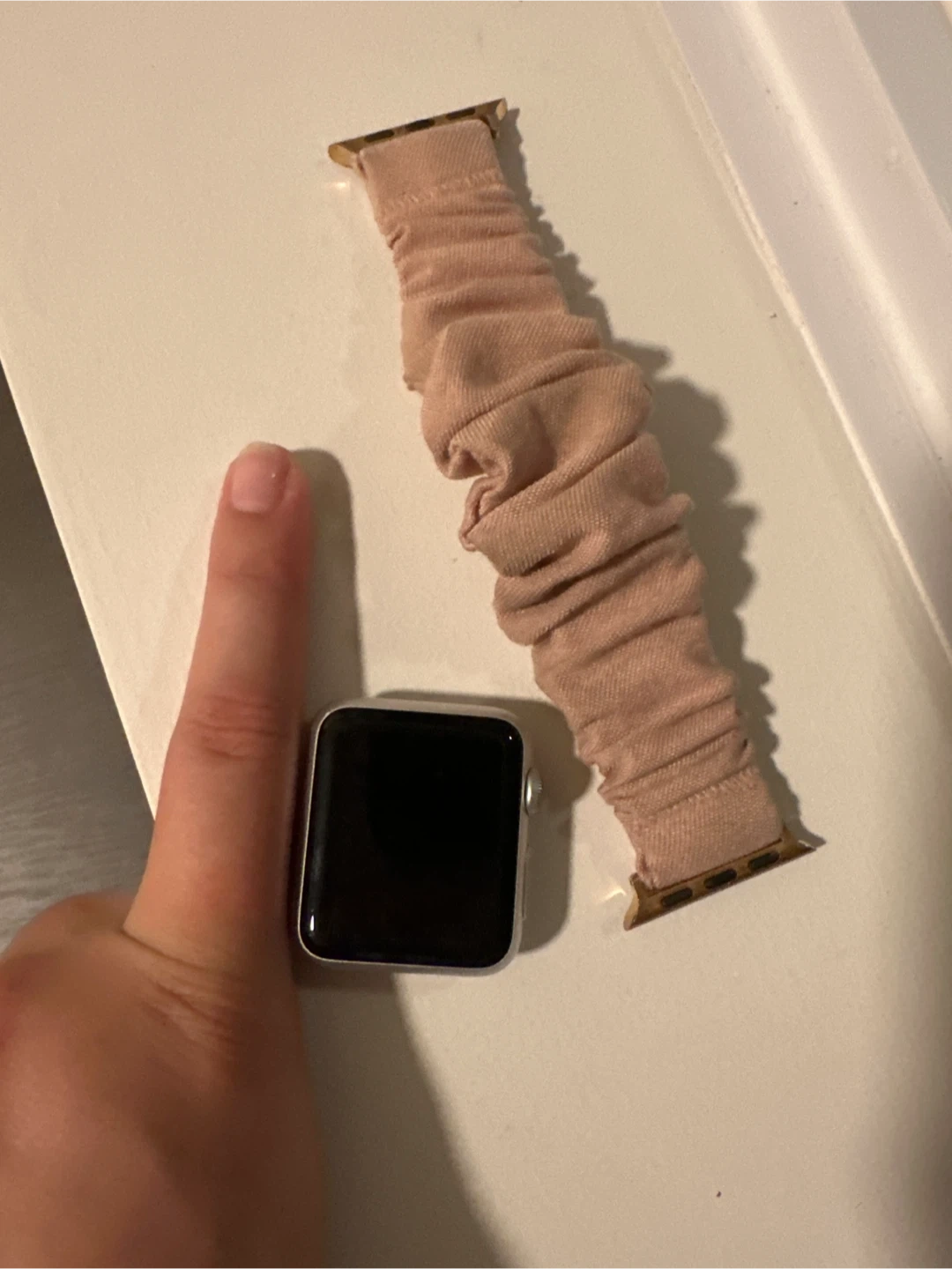 Selling an Apple Watch with a cute scrunchie band! The watch itself is in good condition and comes with the scrunchie band shown in the pictures. Perfect for adding a bit of style to your everyday wear! The watches battery lasts about 3-4 hours
