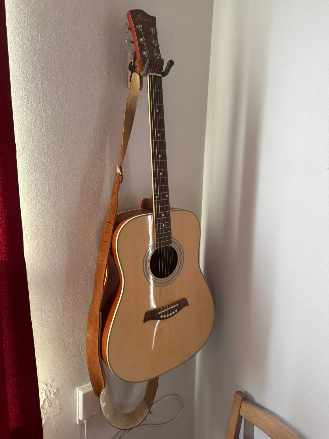 Academy acoustic guitar in a natural wood finish. It comes with a brown leather strap. This guitar is great for beginners and experienced players alike!