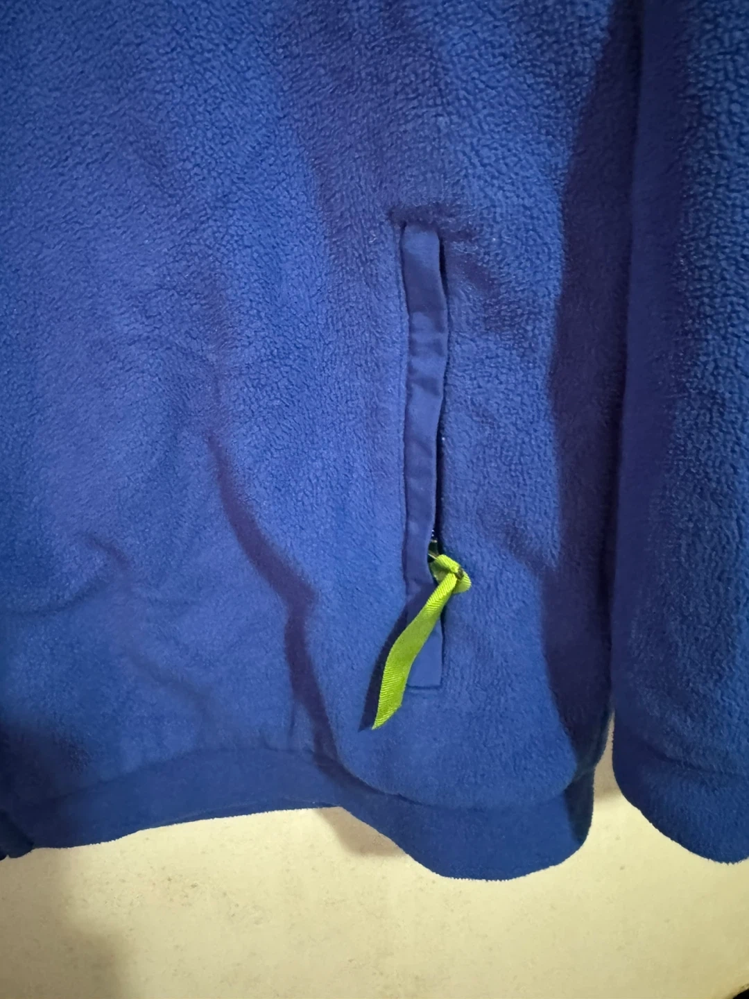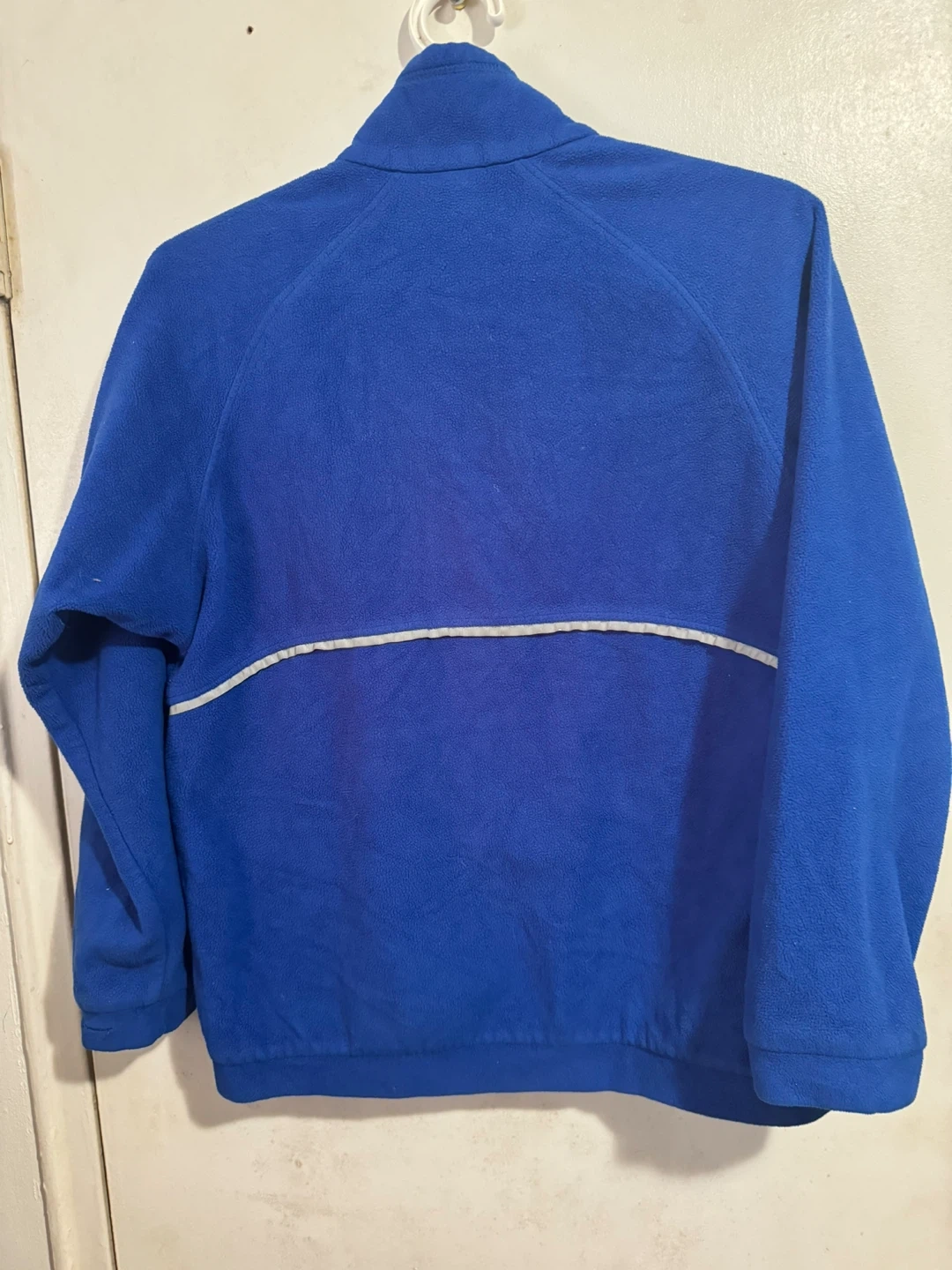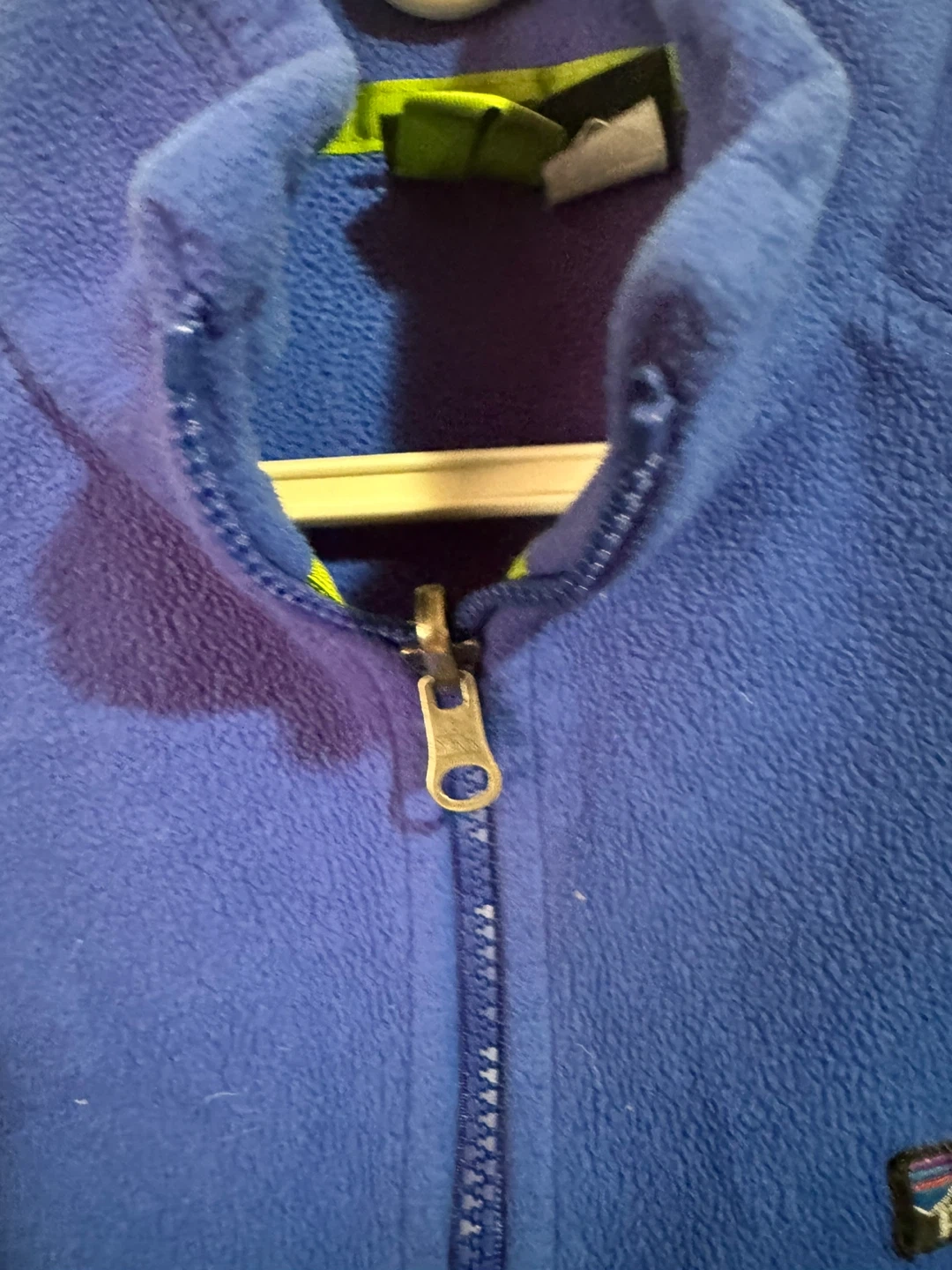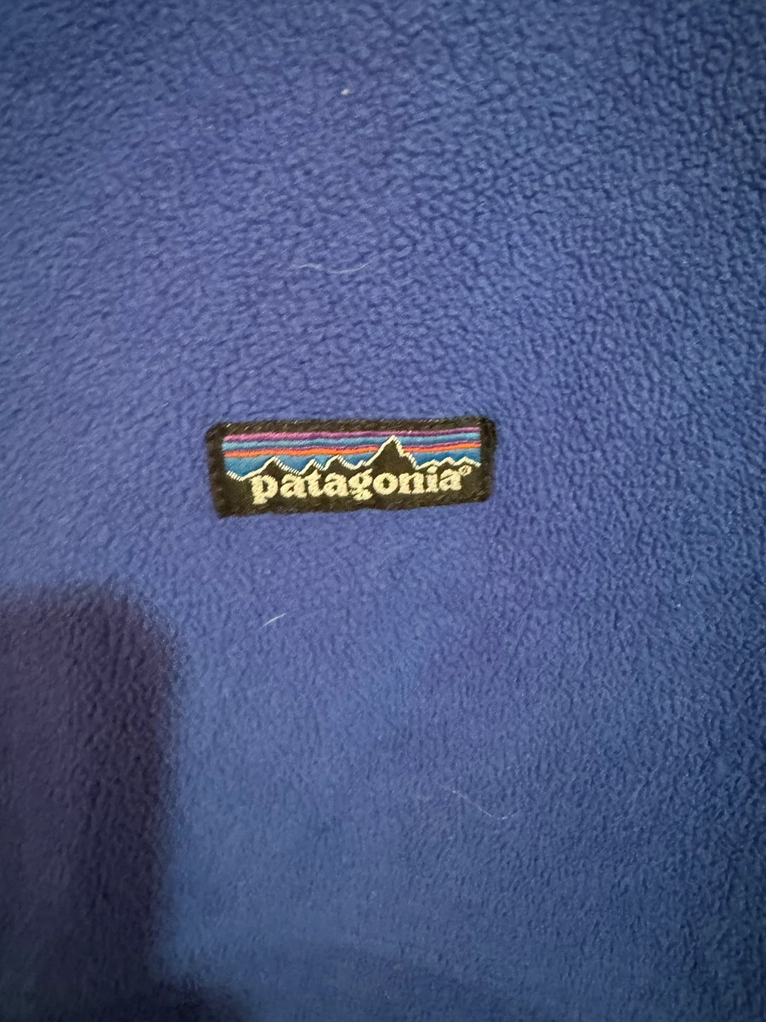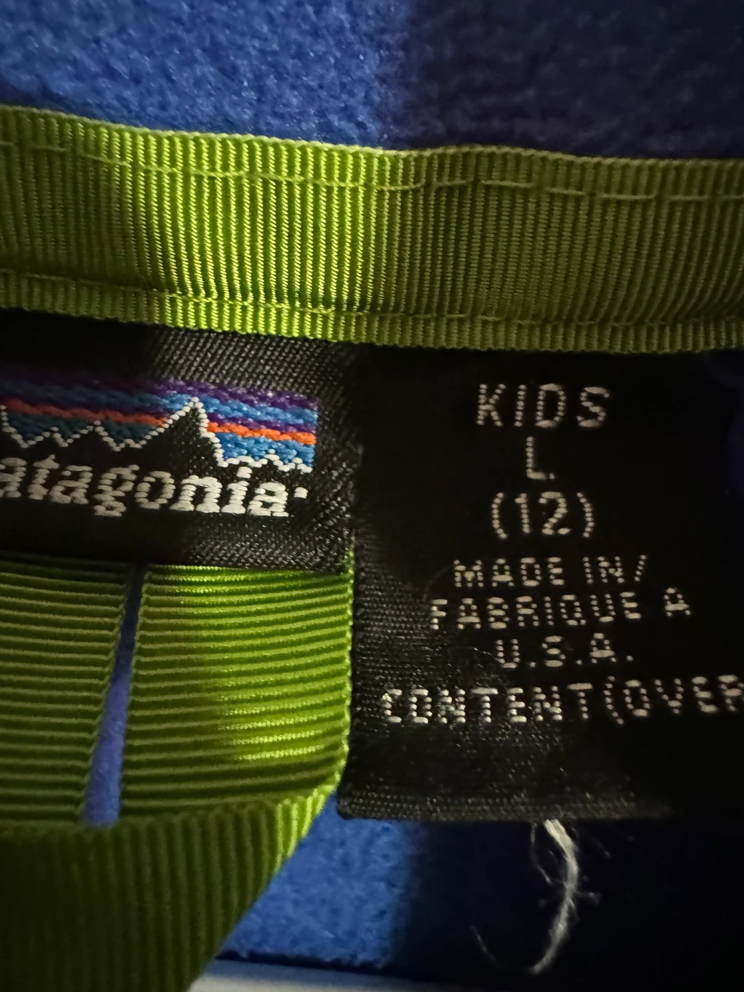 Blue Patagonia fleece jacket for kids. It's a size L (12). Made in the U.S.A. Material is polyester fleece, perfect for staying warm outdoors!