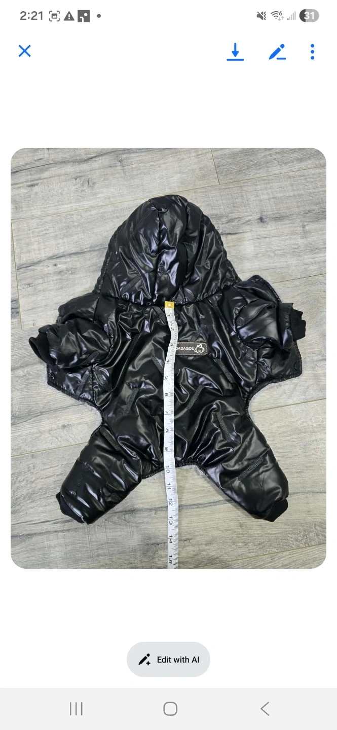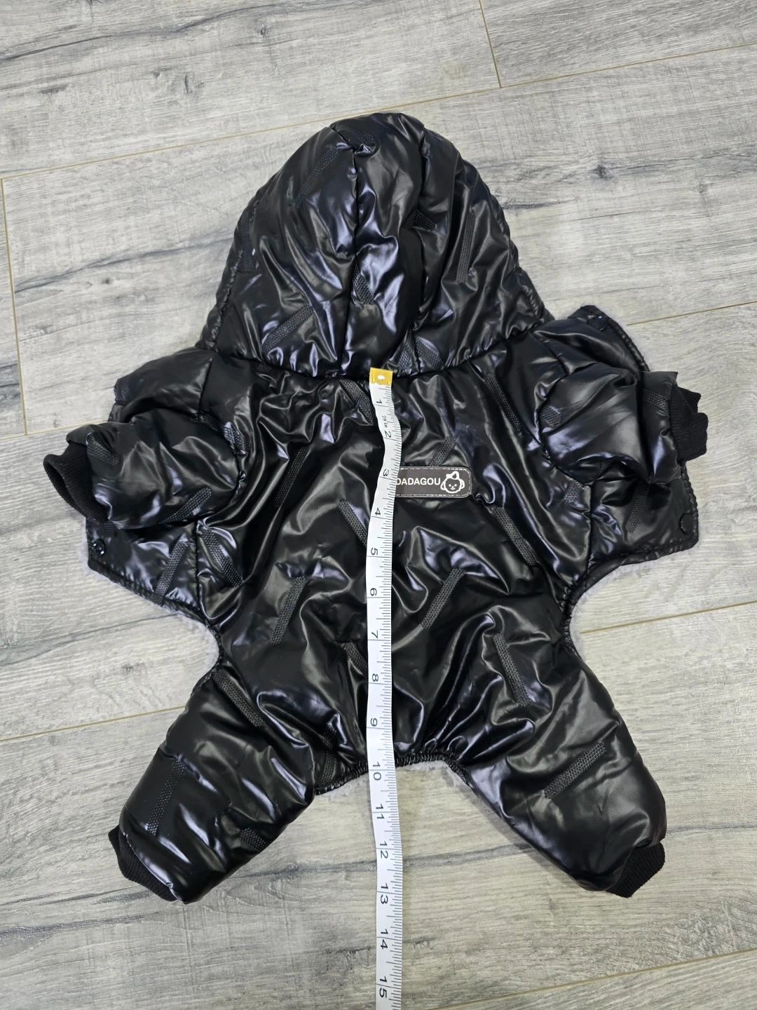 This shiny black winter jacket by DADAGOU is designed for dogs. It features a cozy fleece lining and a hood to keep your pet warm. Water-resistant material helps protect against light precipitation.