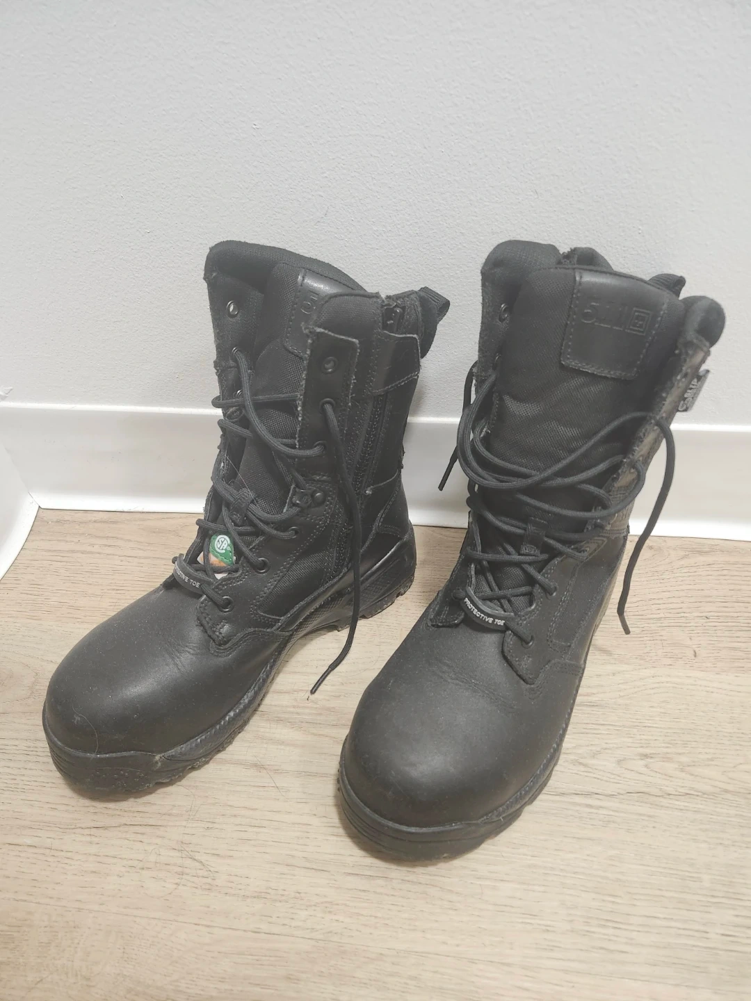 These are 5.11 Tactical black work boots. They feature lace-up and side-zip closures for easy on and off. They have a reinforced protective toe for safety. Perfect for work or tactical use!