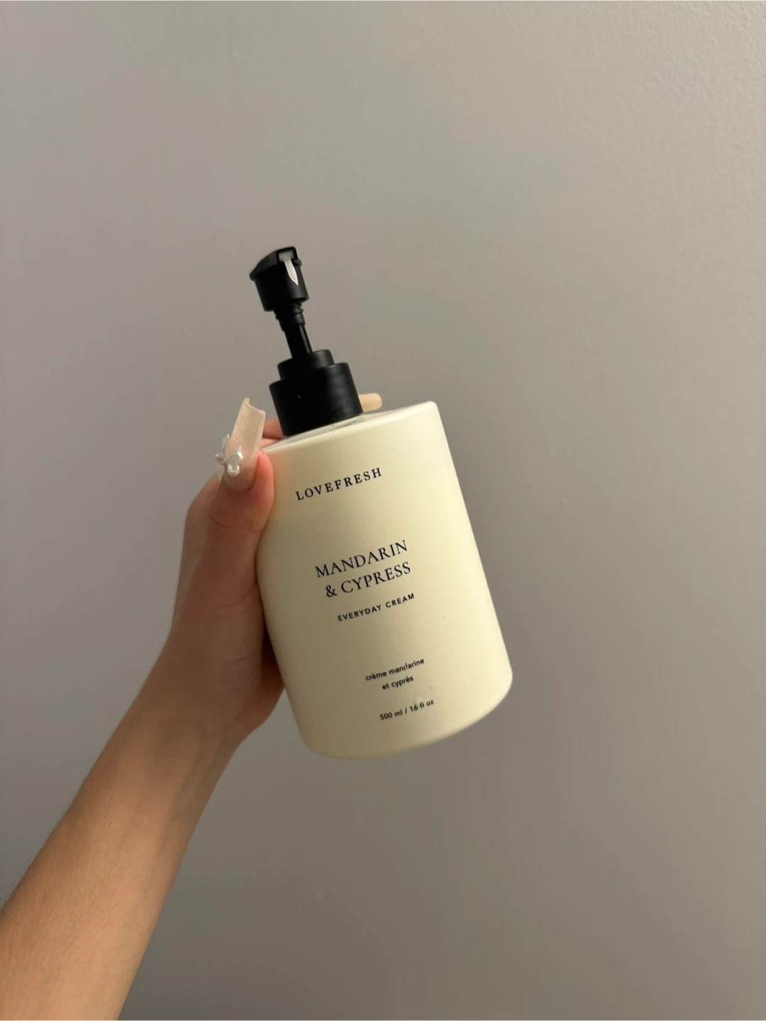 Selling a bottle of LOVEFRESH Mandarin & Cypress Everyday Cream! It contains 500 ml / 16 fl oz of product. Perfect for everyday use!