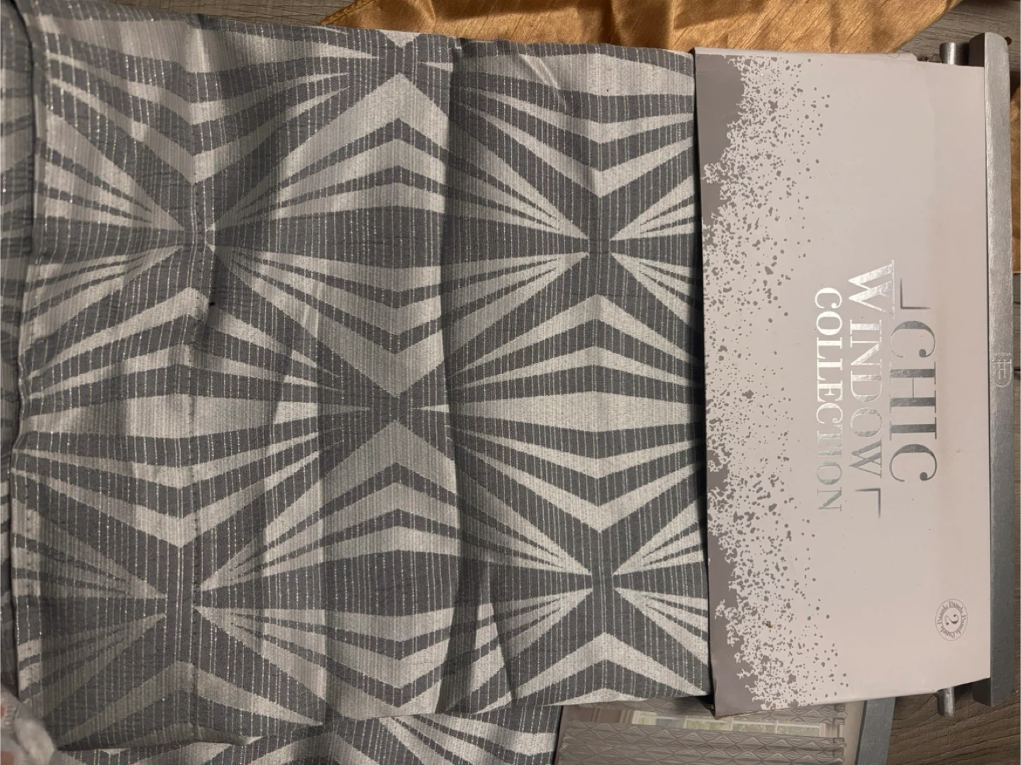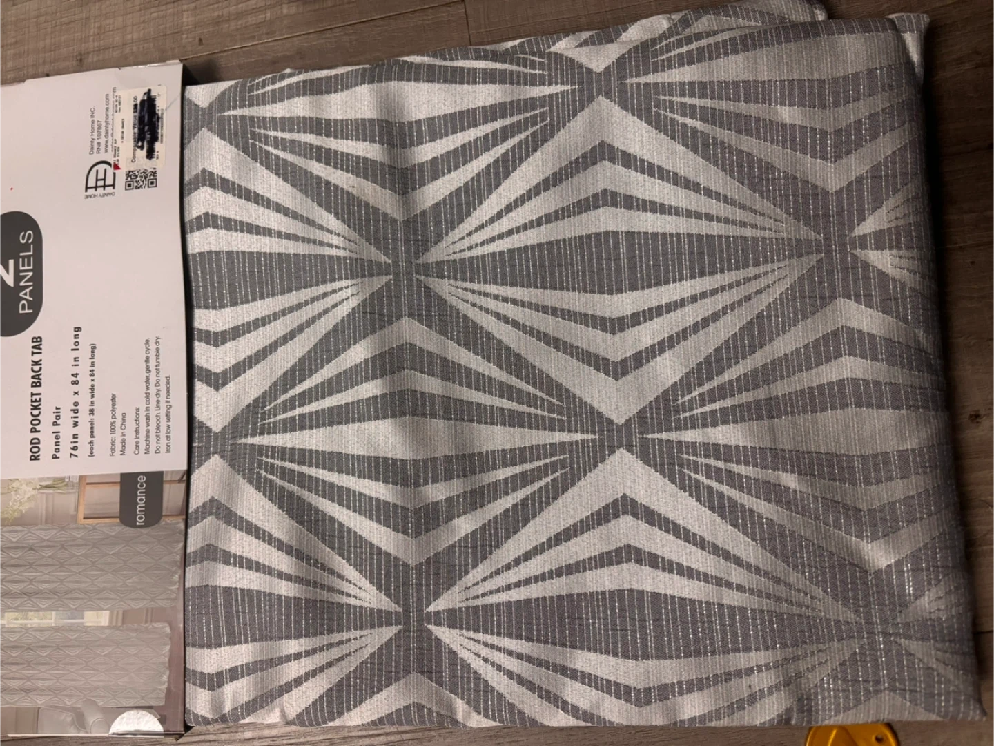 These are two rod pocket back tab window curtain panels. Each panel measures 38 inches wide by 84 inches long, for a total width of 76 inches. The fabric is 100% polyester. Machine wash cold, gentle cycle. Do not bleach or tumble dry.