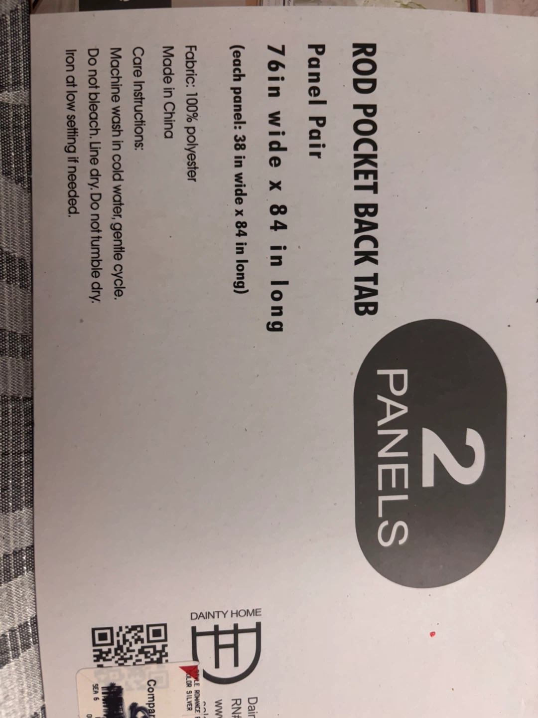 These are two rod pocket back tab window curtain panels. Each panel measures 38 inches wide by 84 inches long, for a total width of 76 inches. The fabric is 100% polyester. Machine wash cold, gentle cycle. Do not bleach or tumble dry.