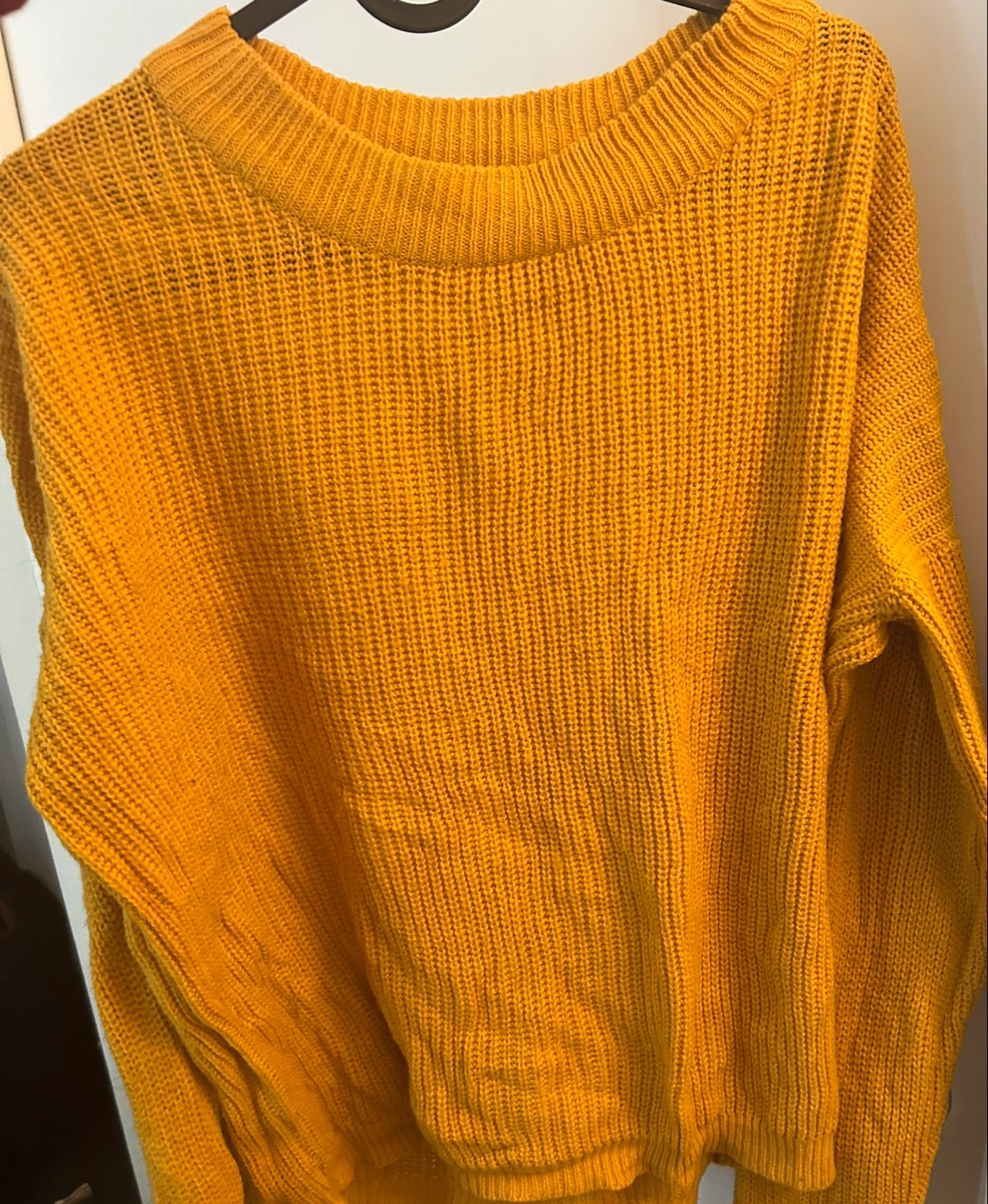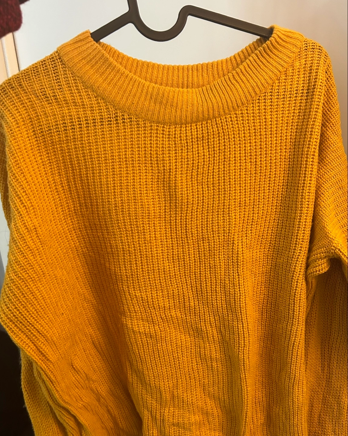 Soft mustard yellow knit sweater. Relaxed fit, long sleeves. Great for fall and winter.