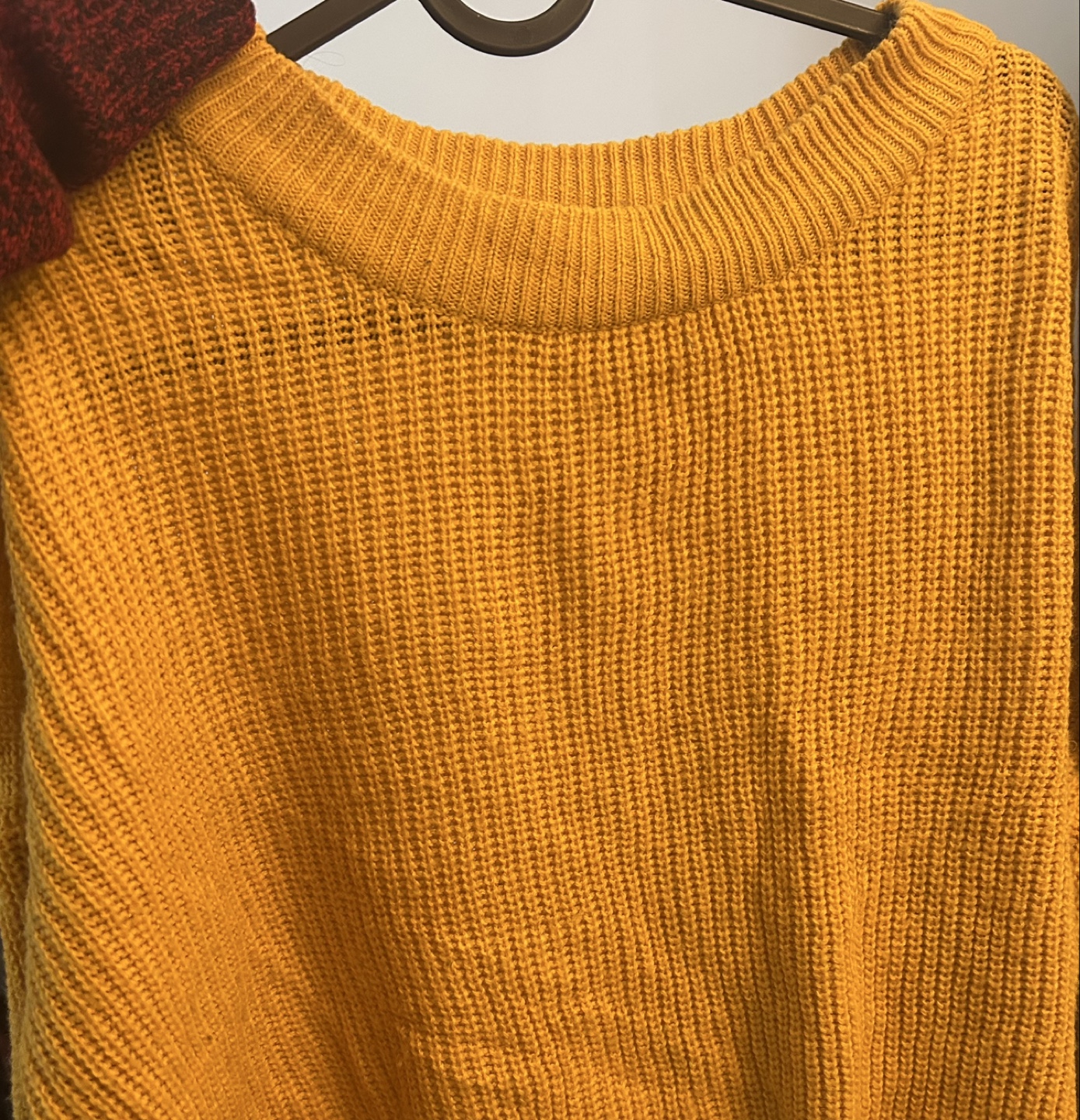 Soft mustard yellow knit sweater. Relaxed fit, long sleeves. Great for fall and winter.