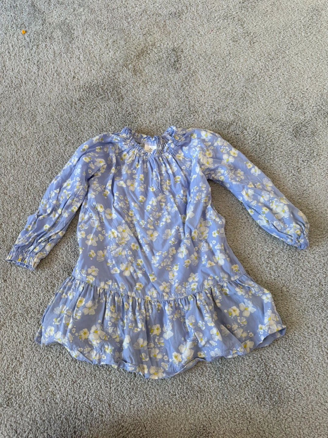 A sweet light blue dress adorned with a ditsy floral print. It features a gathered neckline with elastic and a ruffled hemline. Long sleeves with elasticated cuffs. 98 cm
