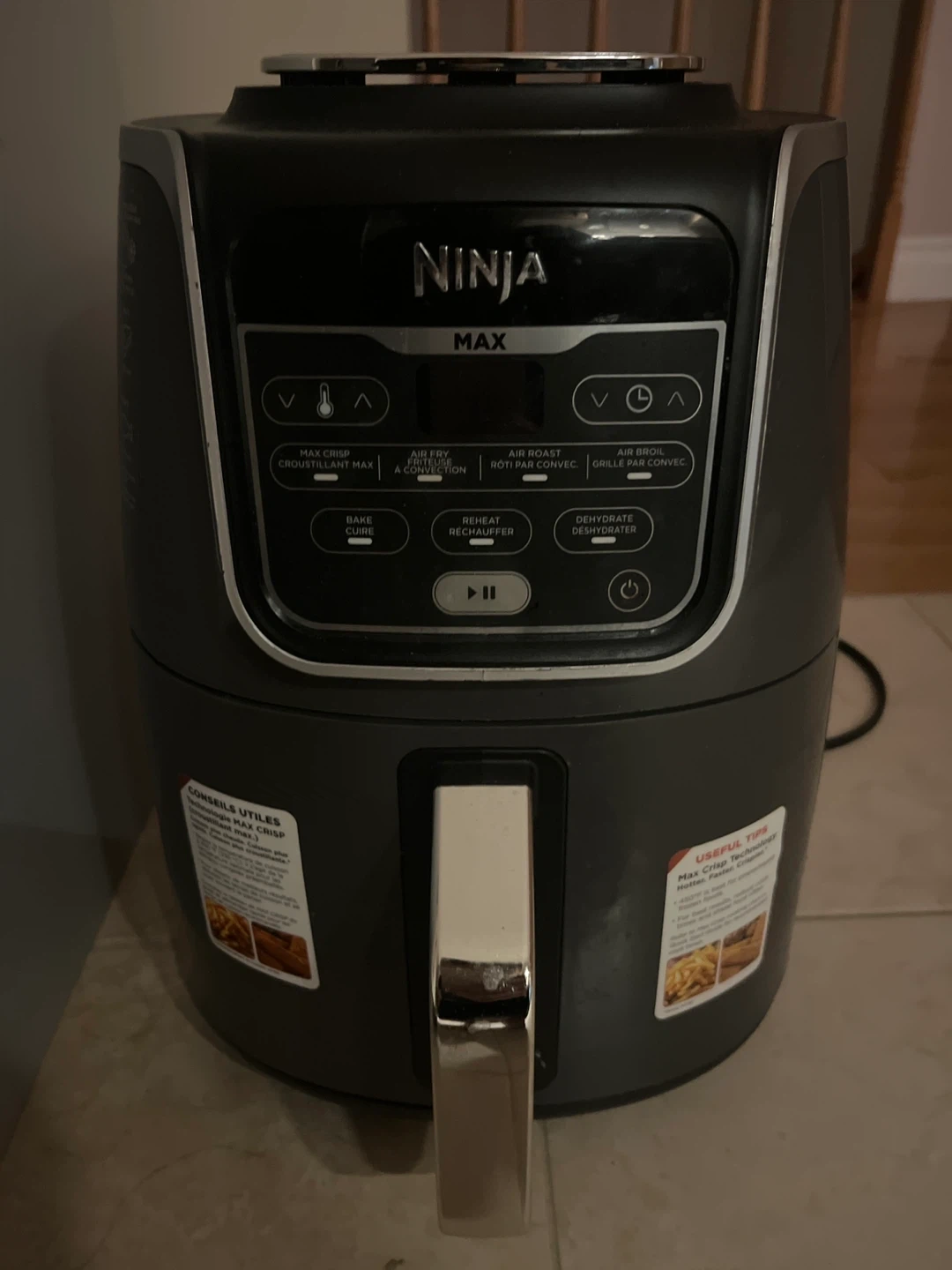 This Ninja Max air fryer offers multiple cooking functions. It includes Max Crisp, Air Fry, Air Roast, Air Broil, Bake, Reheat, and Dehydrate settings. Great for crispy fries and quick meals!