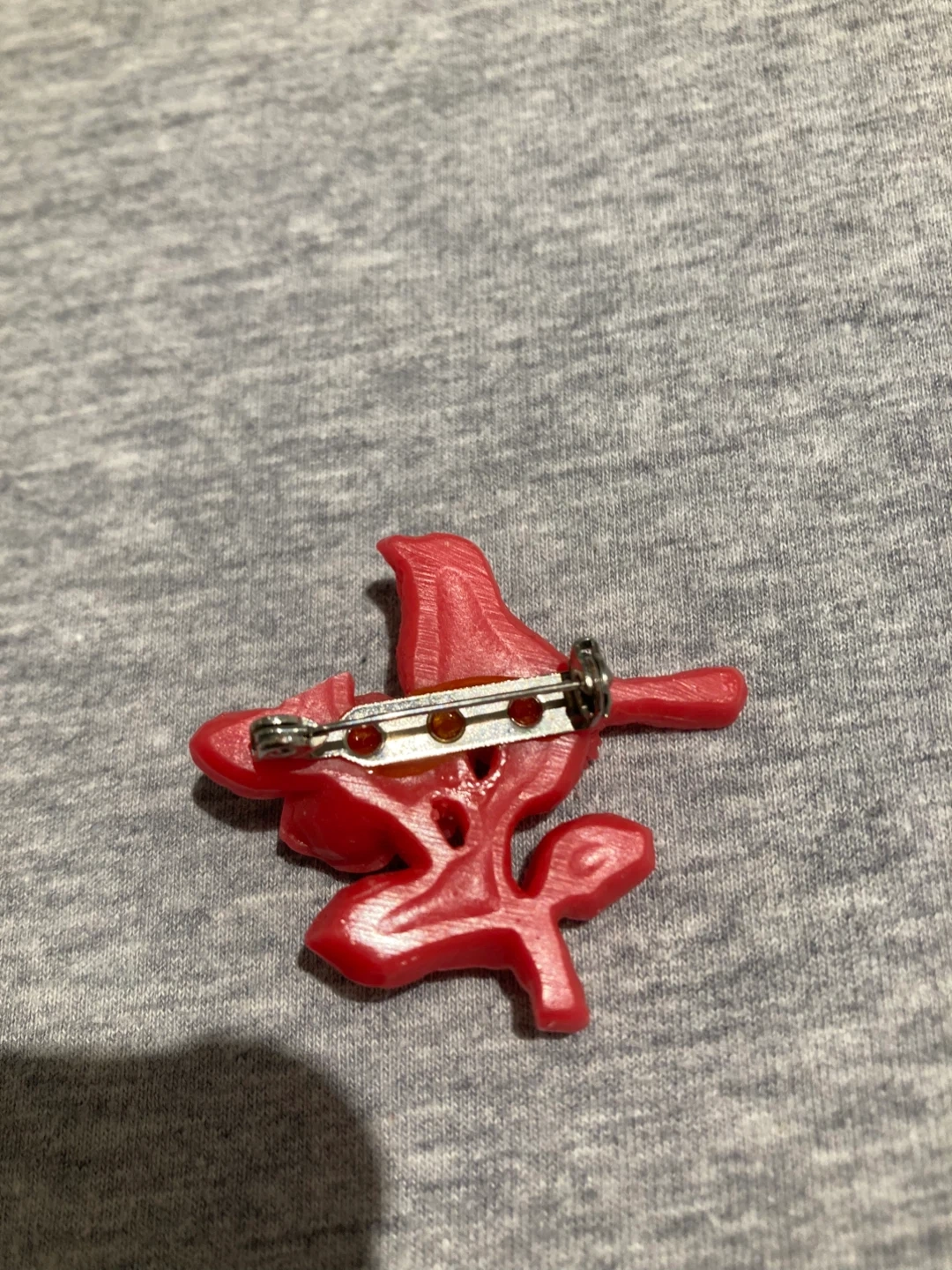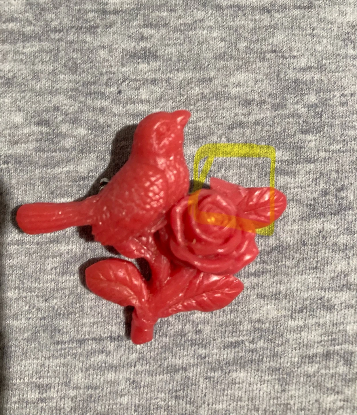 A cute red plastic brooch featuring a bird perched on a rose branch. It's a fun accessory for jackets or bags!