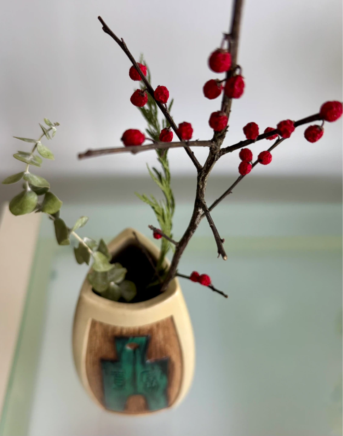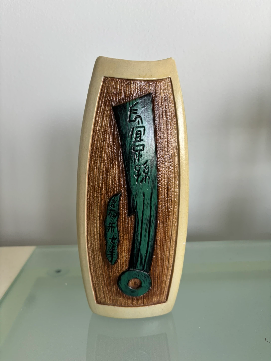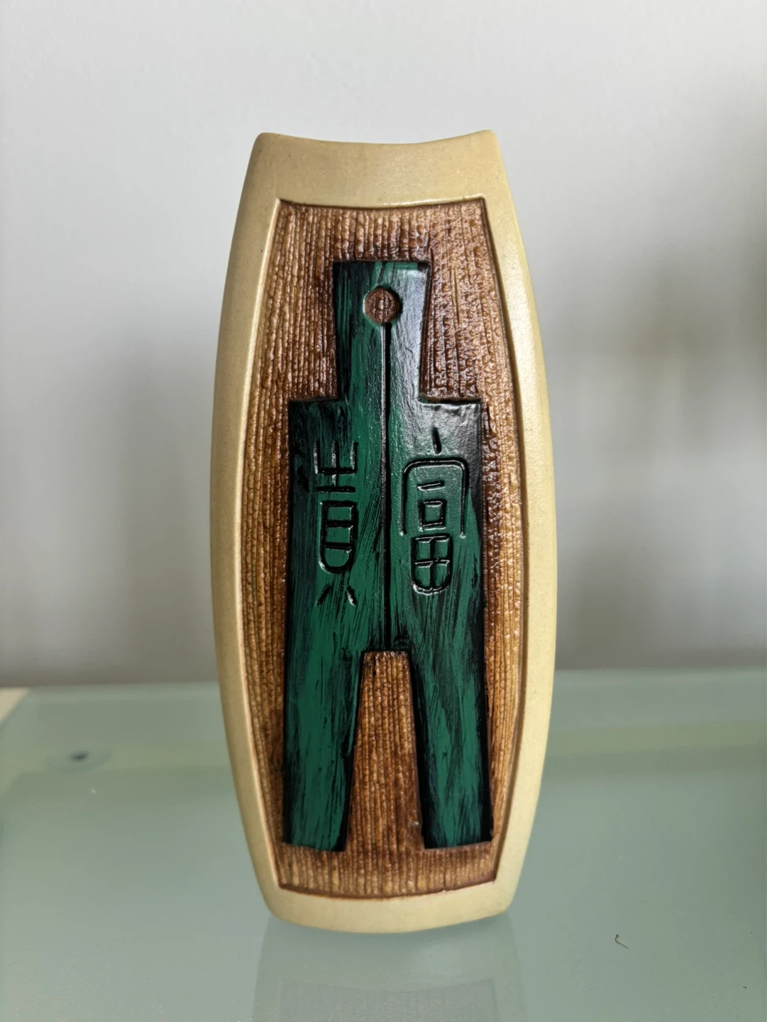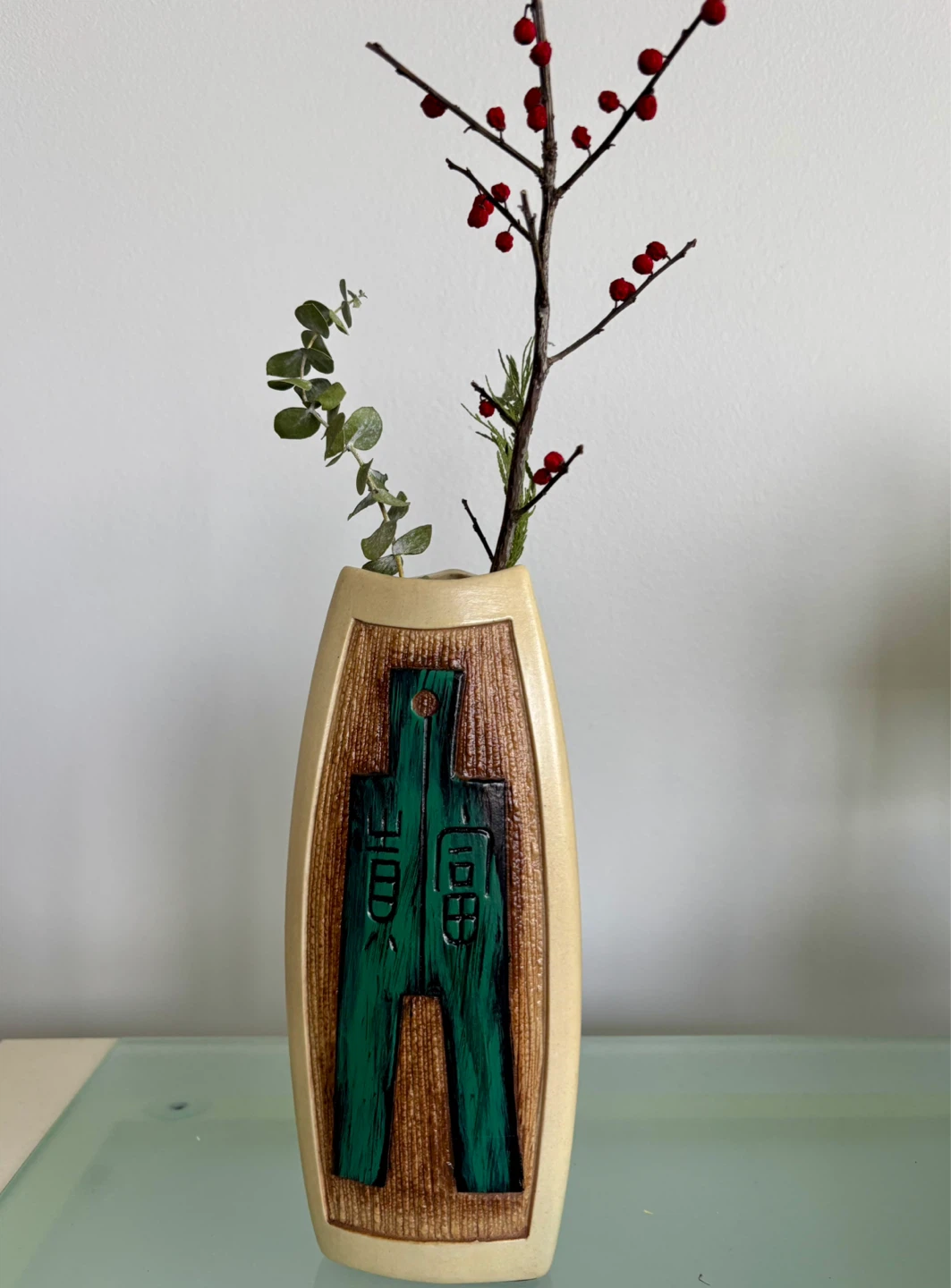 This decorative ceramic vase features a cream-coloured finish with embossed brown wood-grain detailing. It has green accents with Asian-inspired characters and coin motifs. The vase is suitable for displaying dried flowers or as a standalone decorative piece.