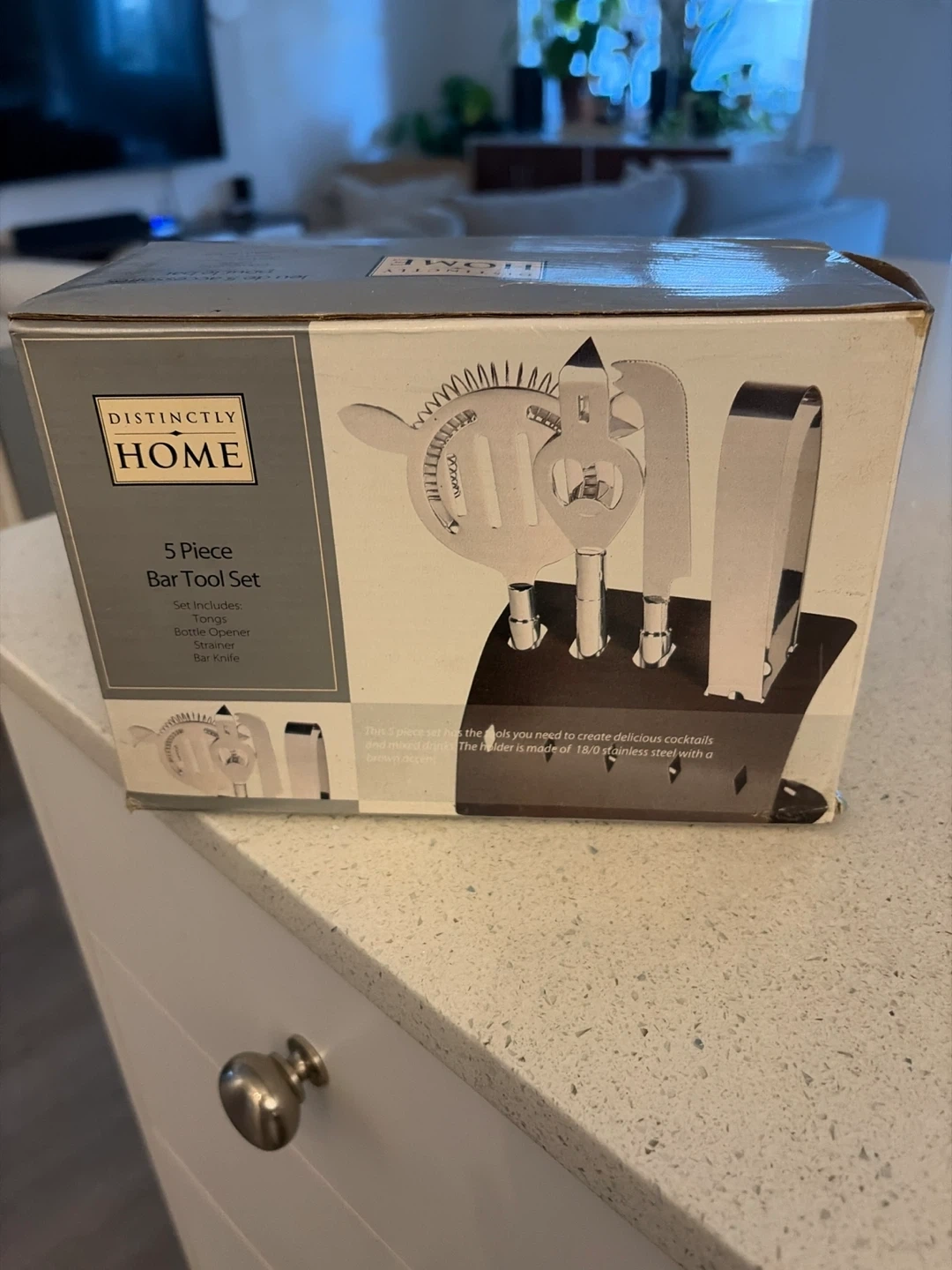 This 5-piece bar tool set includes tongs, a bottle opener, a strainer, and a bar knife. The holder is made of 18/0 stainless steel. It has a brown accent.