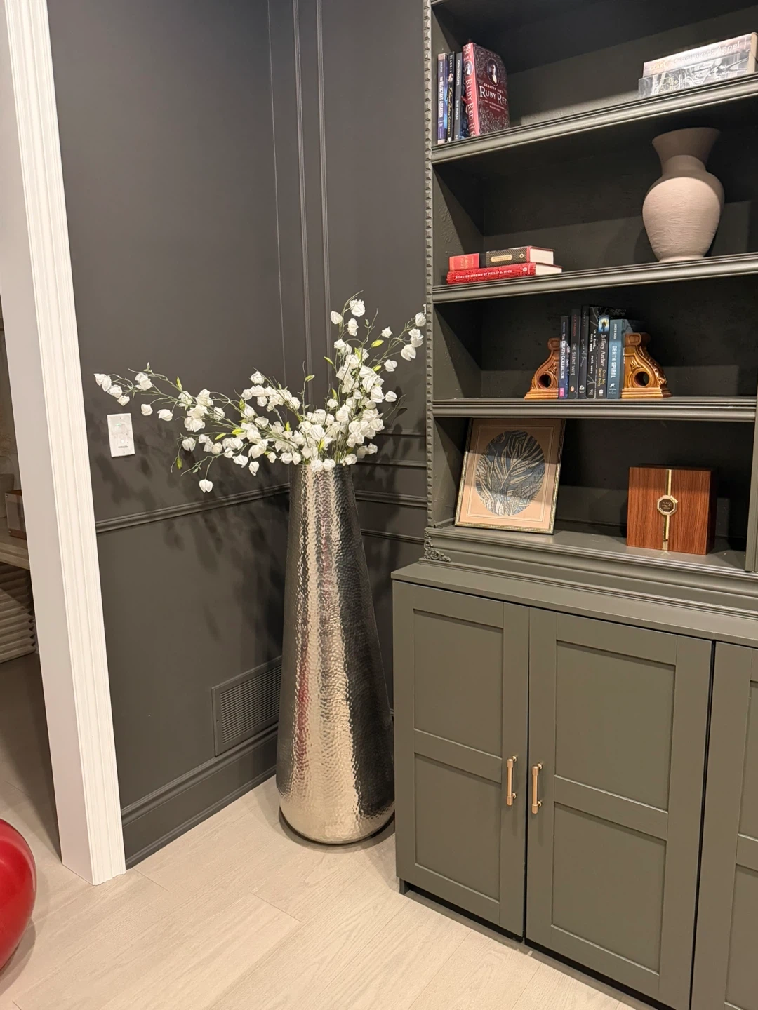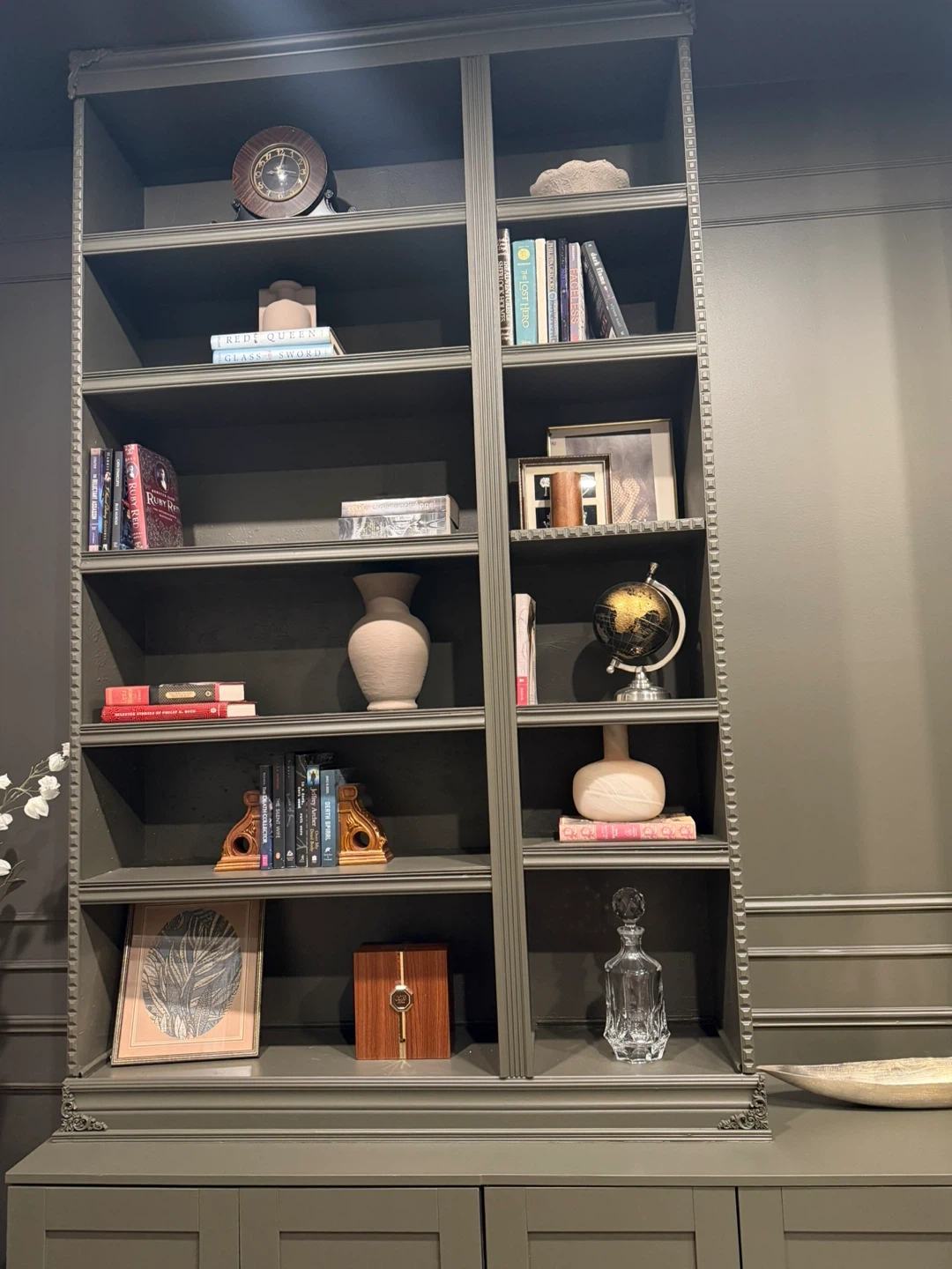 A collection of books displayed on grey bookshelves. Various titles and authors are visible. Also includes decorative items like vases, a globe, and bookends. Perfect for a home library or study.