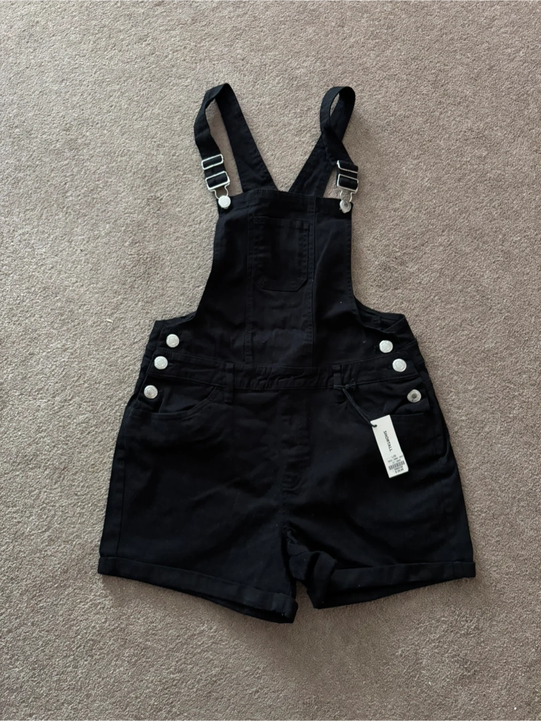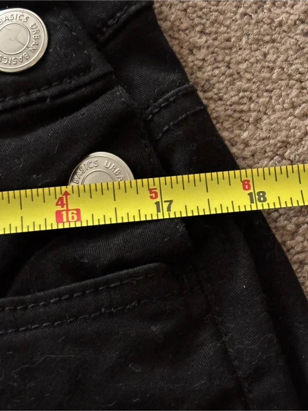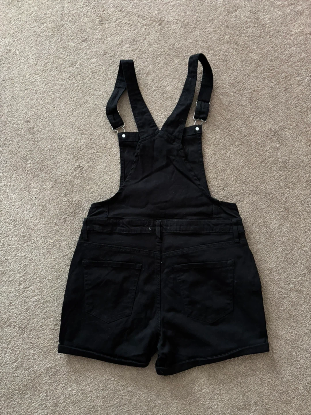 These black denim shortalls are made of a cotton blend. They feature adjustable straps and button closures on the sides. Waistband measures 32 inches across.