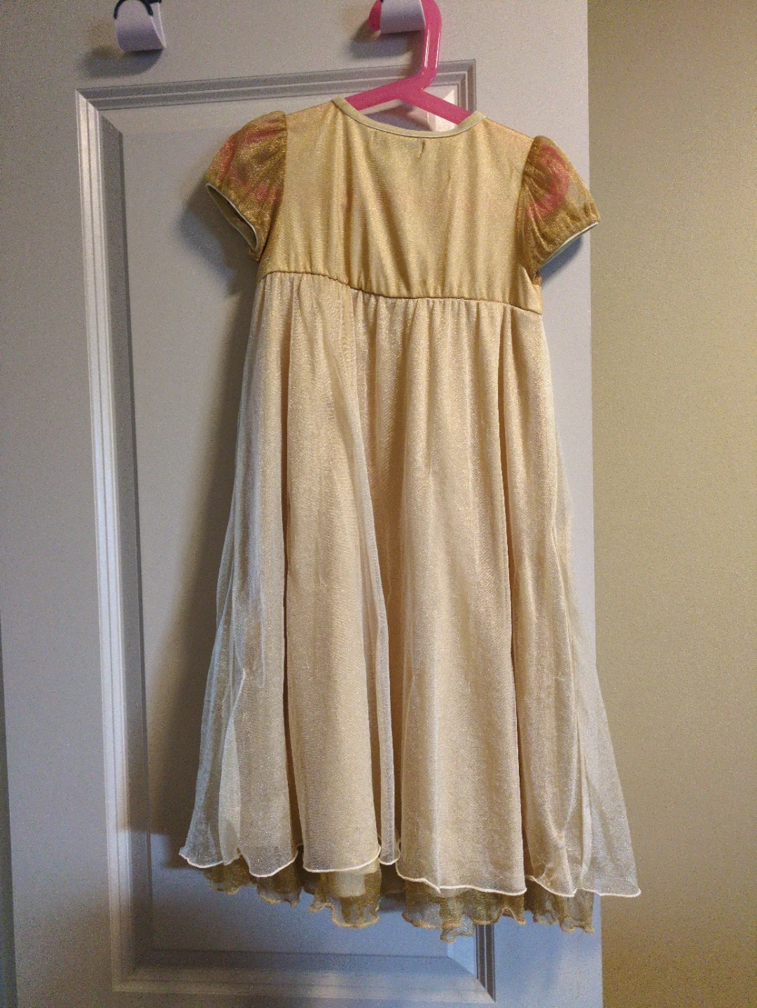 This is a beautiful Disney Princess dress. It features a gold bodice with sparkly puff sleeves. The skirt is made of sheer, shimmery fabric with an overlay.