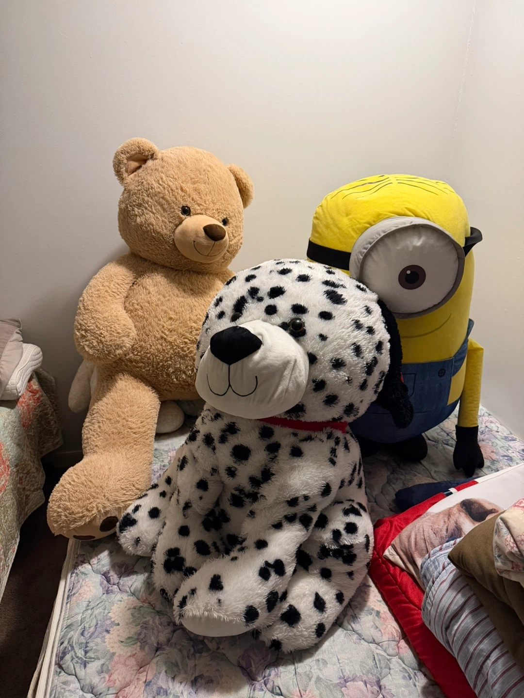Human-sized Plushies: Teddy Bear, Dalmatian, and Minion