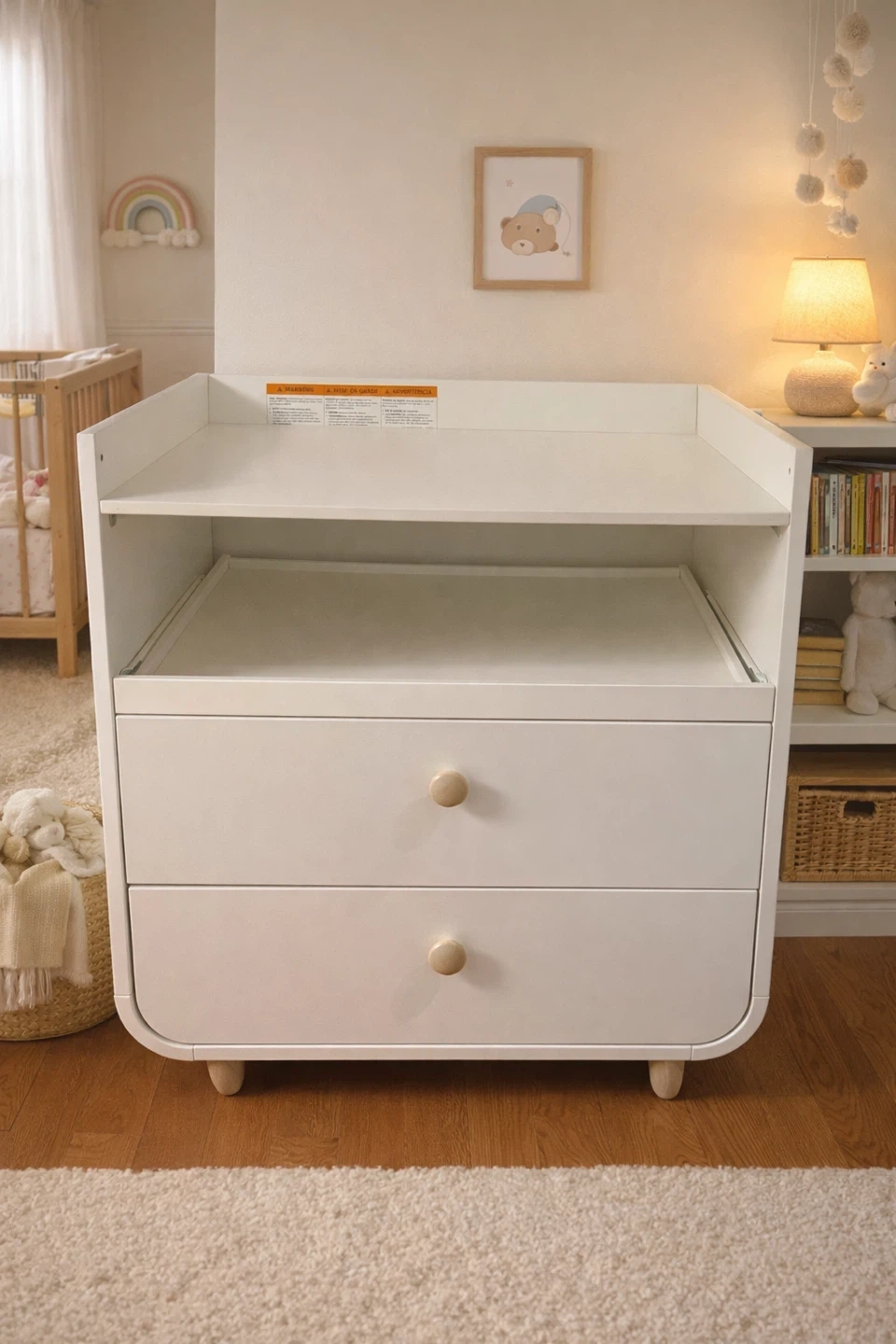 Clean, minimal design that works well in a nursery, kid’s room, or even as regular storage.