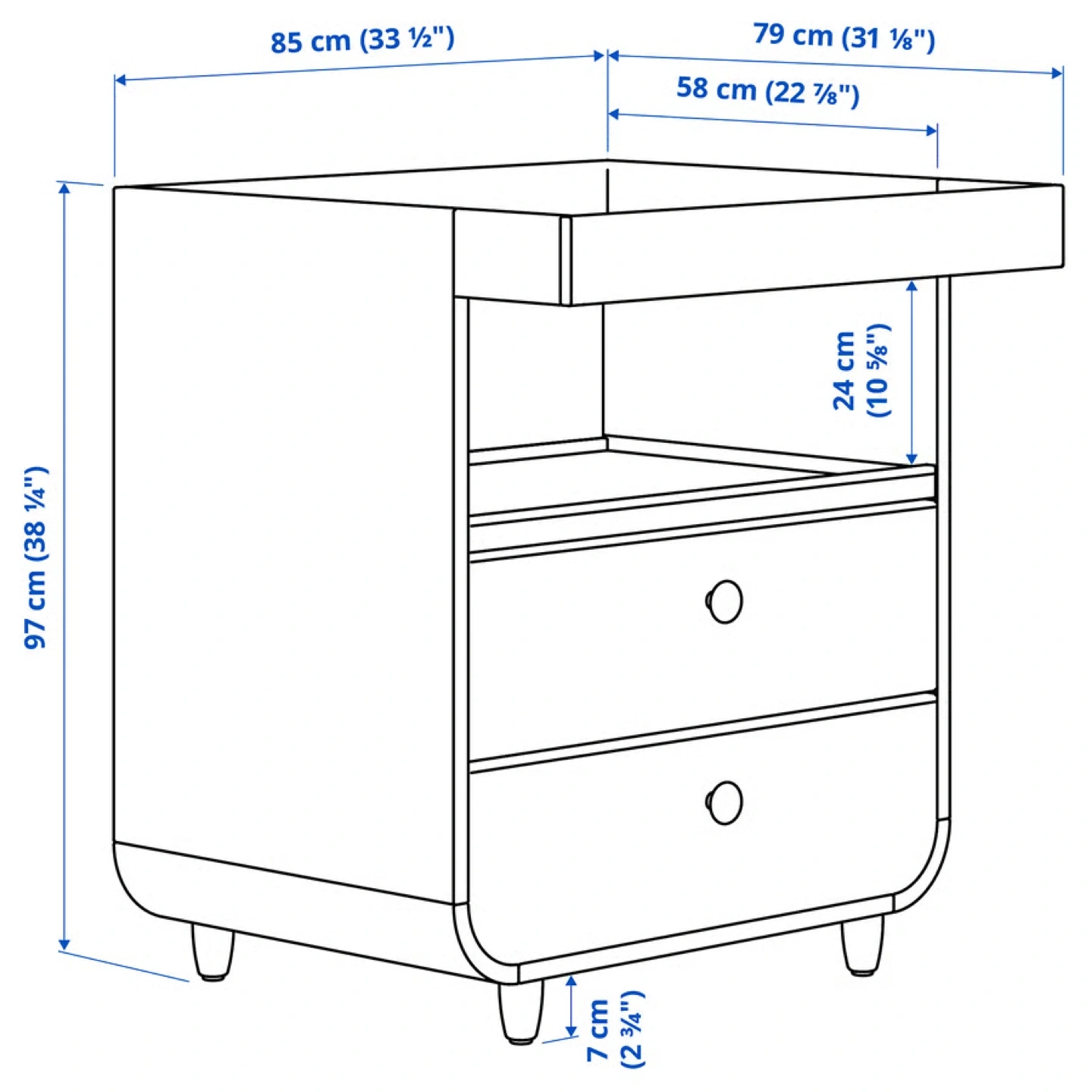 • Depth: 58 cm (this is the actual depth of the dresser without the changing attachment)